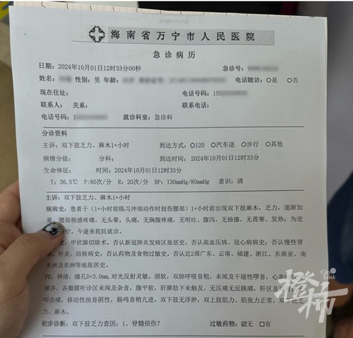 医生面诊,做感觉测试,说是截瘫了,需要后续核磁检查,且在考虑转院。