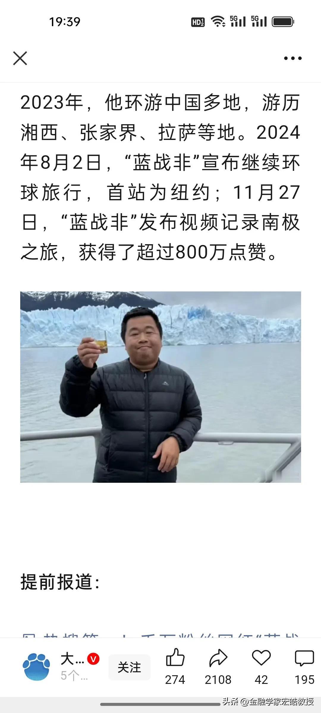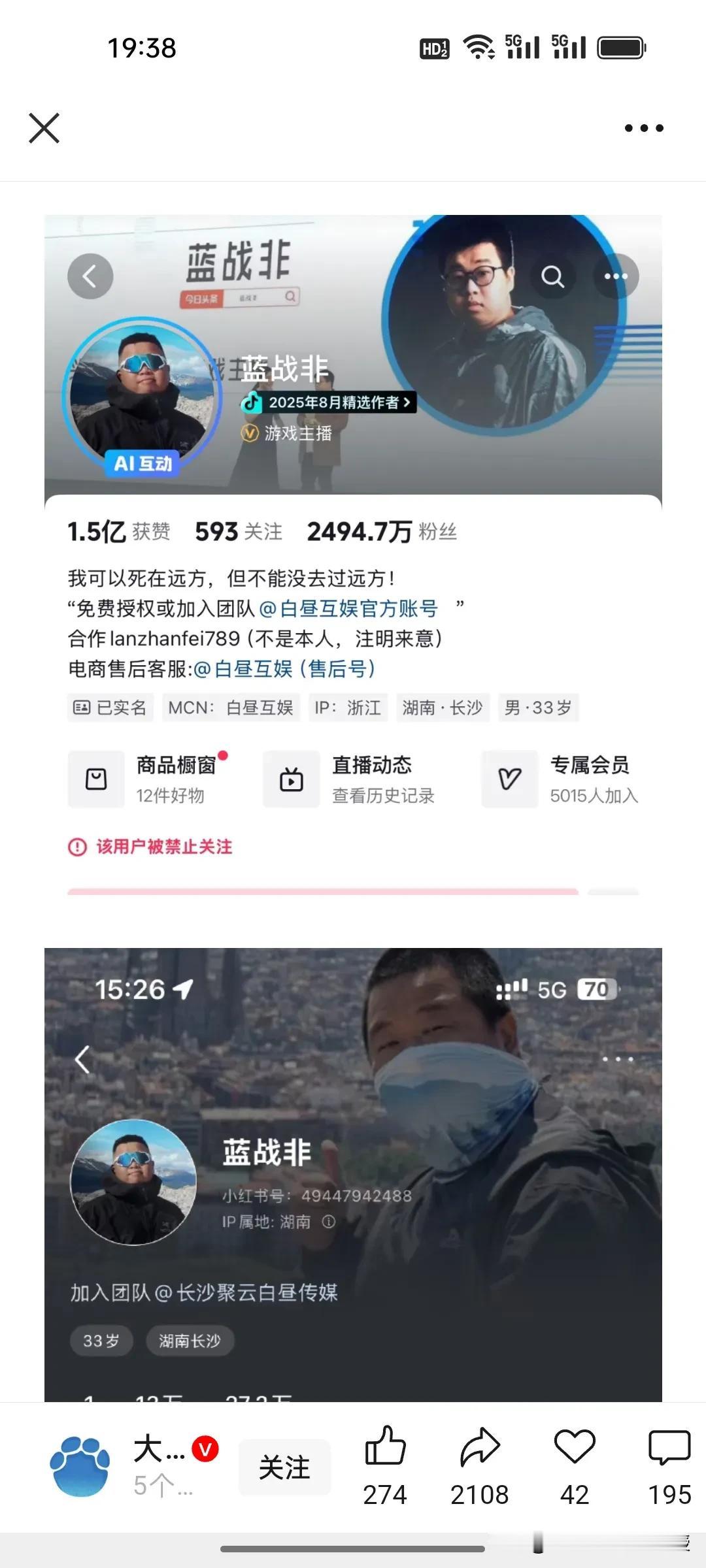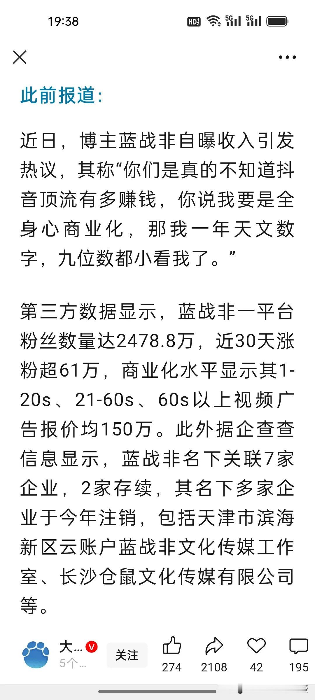 张雪峰,蓝战非自媒体账号先后被禁止关注,释放了什么信号?刚刚,根据《红星新闻》报道,2500万粉丝旅游博主蓝战非的抖音和小红书账号被禁止关注,昨天张雪峰账号也全面被禁止关注,今天其团队称在反思。 蓝战非近期自曝收入引起热议,九位数的收入在抖音顶流达人中也很常见,尤其带货主播,他还一点不遮掩地跟大家分享。张雪峰前段时间“要是打仗捐款5000万”事件闹得沸沸扬扬,目前正值互联网生态整治期间,快手,微博等相继被国家有关部门约谈,作为大V,粉丝多,传播力度大,发言更要谨小慎微,不能越过互联网传播规范的底线。