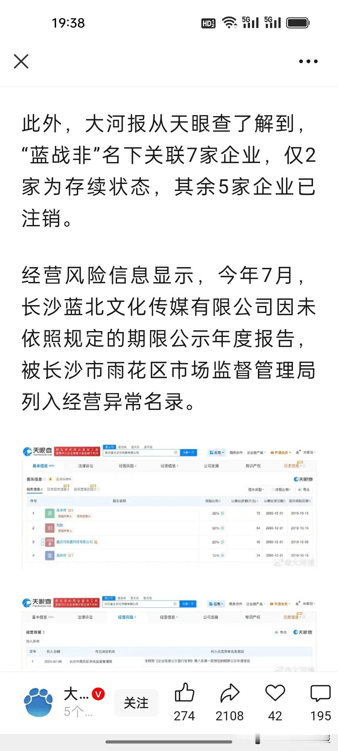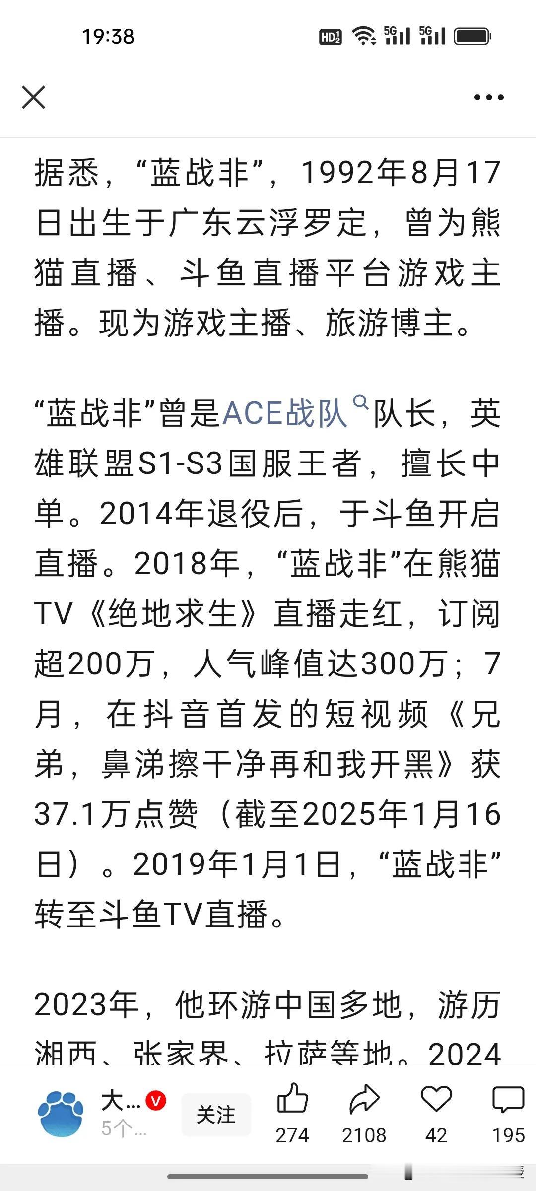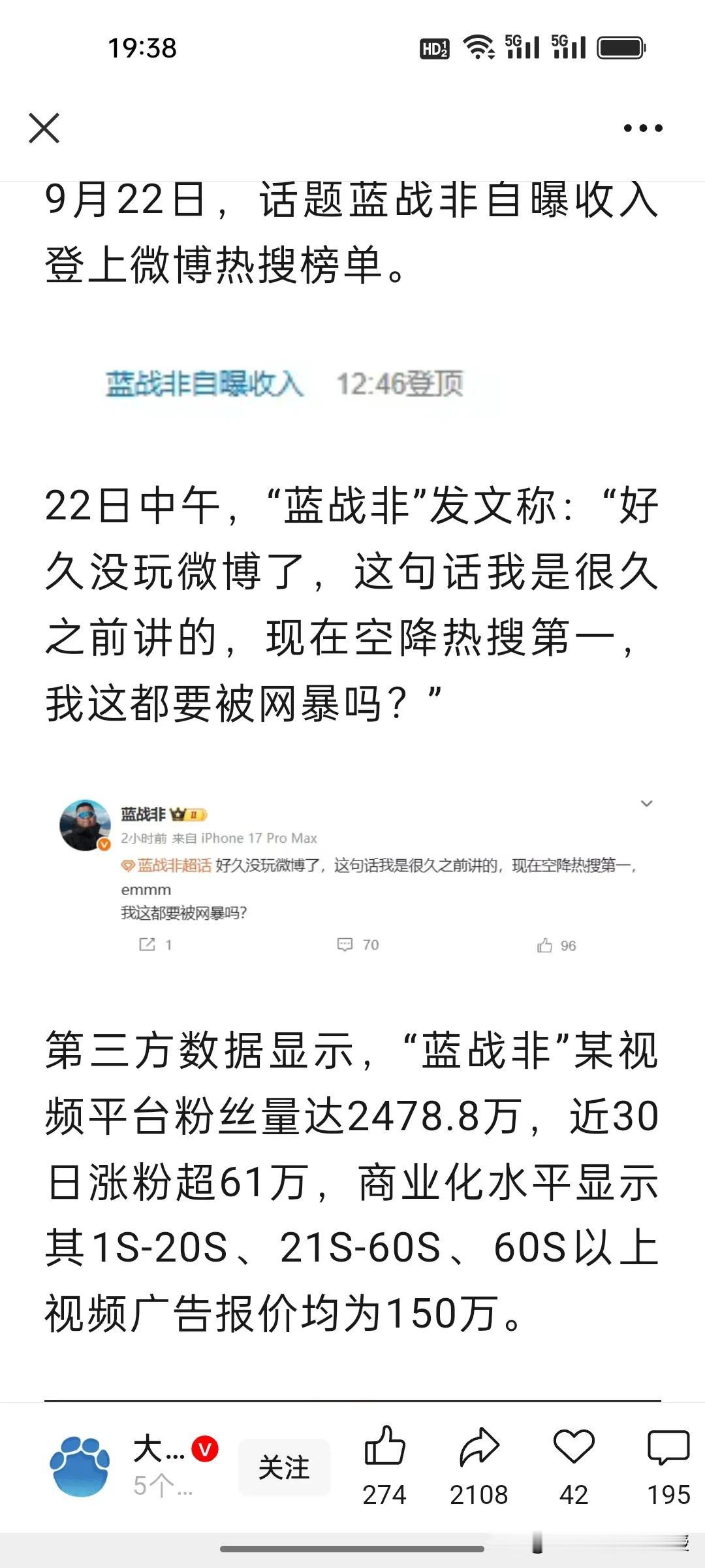 张雪峰,蓝战非自媒体账号先后被禁止关注,释放了什么信号?刚刚,根据《红星新闻》报道,2500万粉丝旅游博主蓝战非的抖音和小红书账号被禁止关注,昨天张雪峰账号也全面被禁止关注,今天其团队称在反思。 蓝战非近期自曝收入引起热议,九位数的收入在抖音顶流达人中也很常见,尤其带货主播,他还一点不遮掩地跟大家分享。张雪峰前段时间“要是打仗捐款5000万”事件闹得沸沸扬扬,目前正值互联网生态整治期间,快手,微博等相继被国家有关部门约谈,作为大V,粉丝多,传播力度大,发言更要谨小慎微,不能越过互联网传播规范的底线。