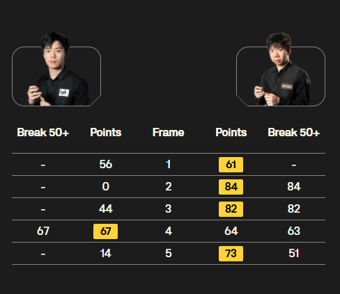 全场比赛,雷佩凡打出4杆50+(84、82、63、51),张家玮打出一杆50+(67).
