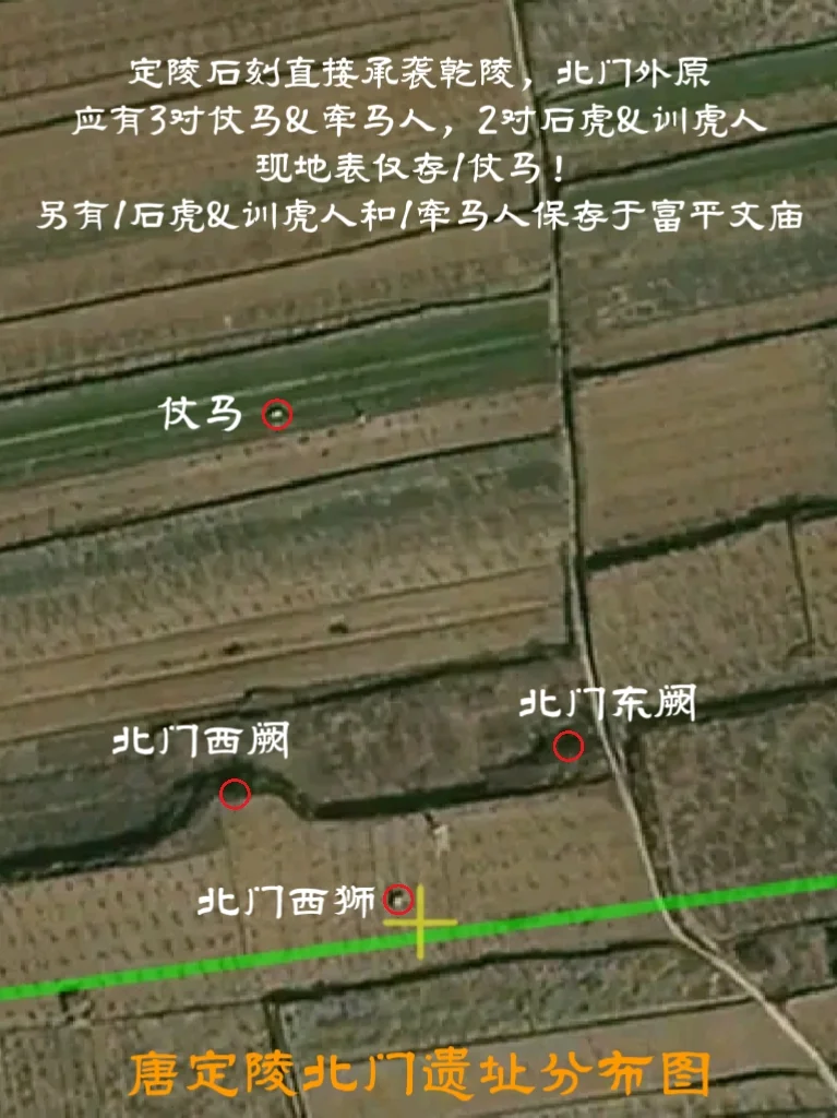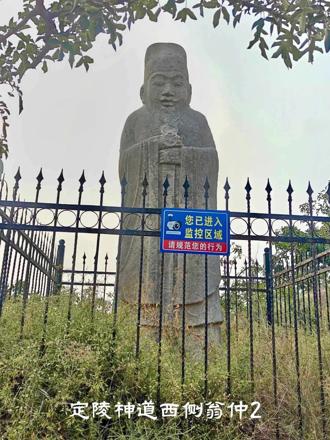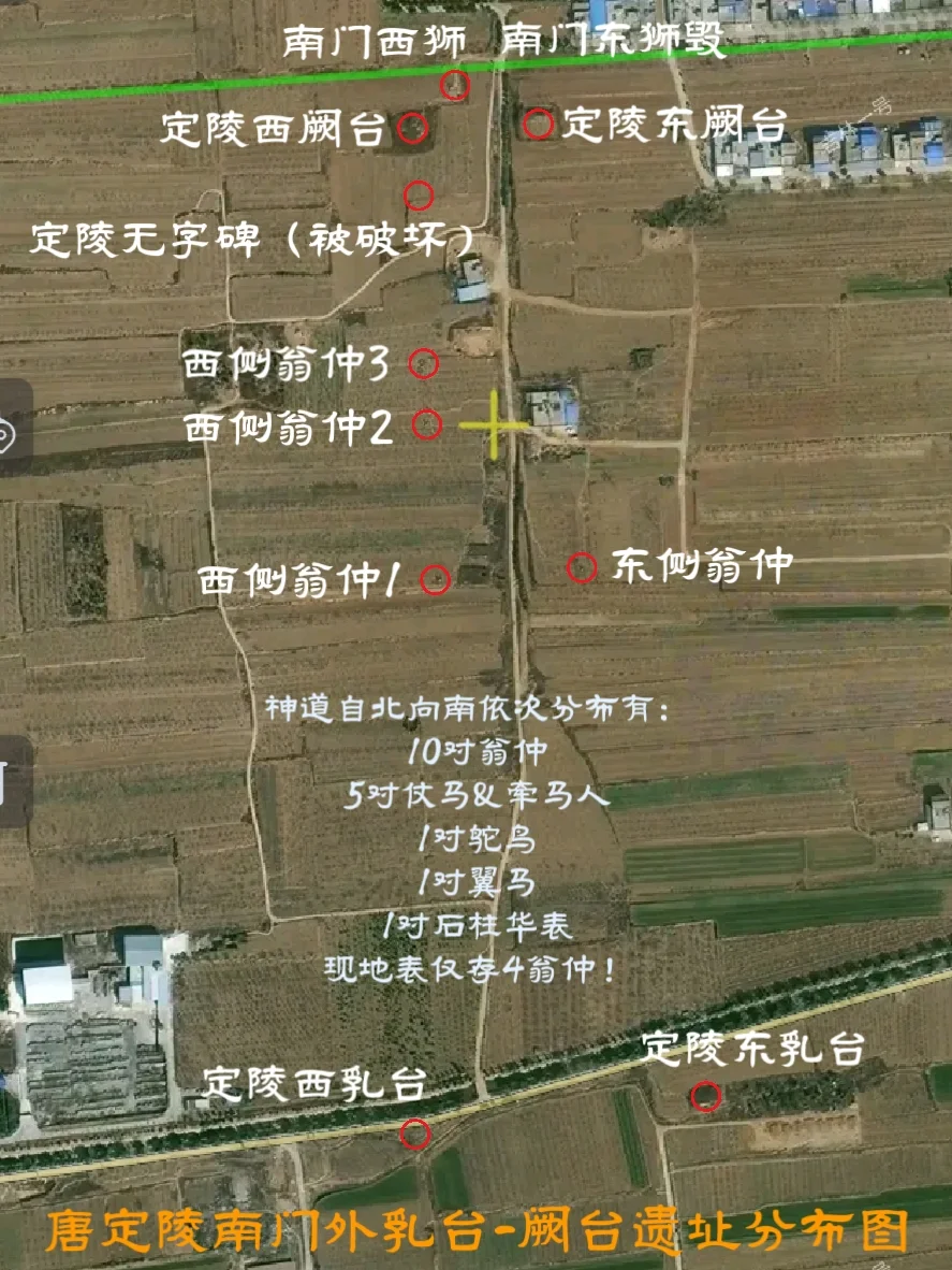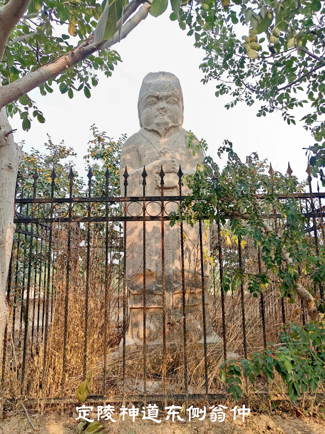 自乾陵之后,诸唐帝陵南门神道石刻自南向北依次为:石柱华表、翼马、鸵鸟、仗马&牵马人5对和翁仲10对,现定陵地表神道石刻仅存4尊翁仲,其余石刻或埋地下,或被毁。