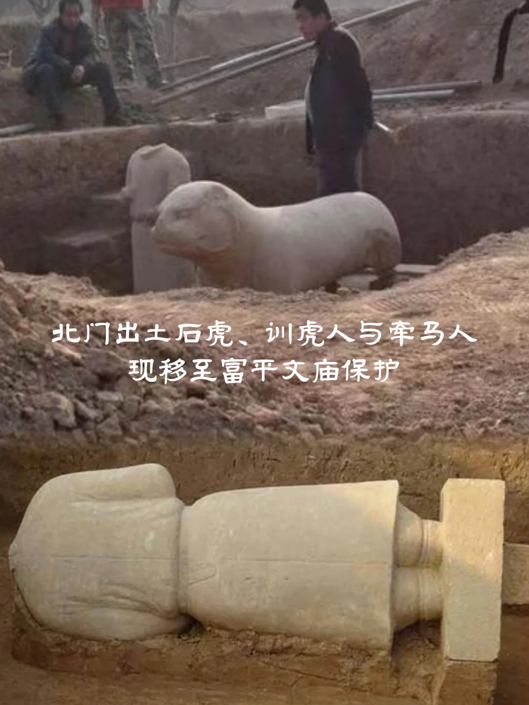 北门除一对石狮外,还会设置3对仗马&牵马人和2对石虎&驯虎人,现地表仅存1仗马。在10年前的定陵陵园考古勘探中,北门外新挖出1件石虎(也有观点为豹)、1件驯虎人和1牵马人,迁移至富平文庙博物馆保护。