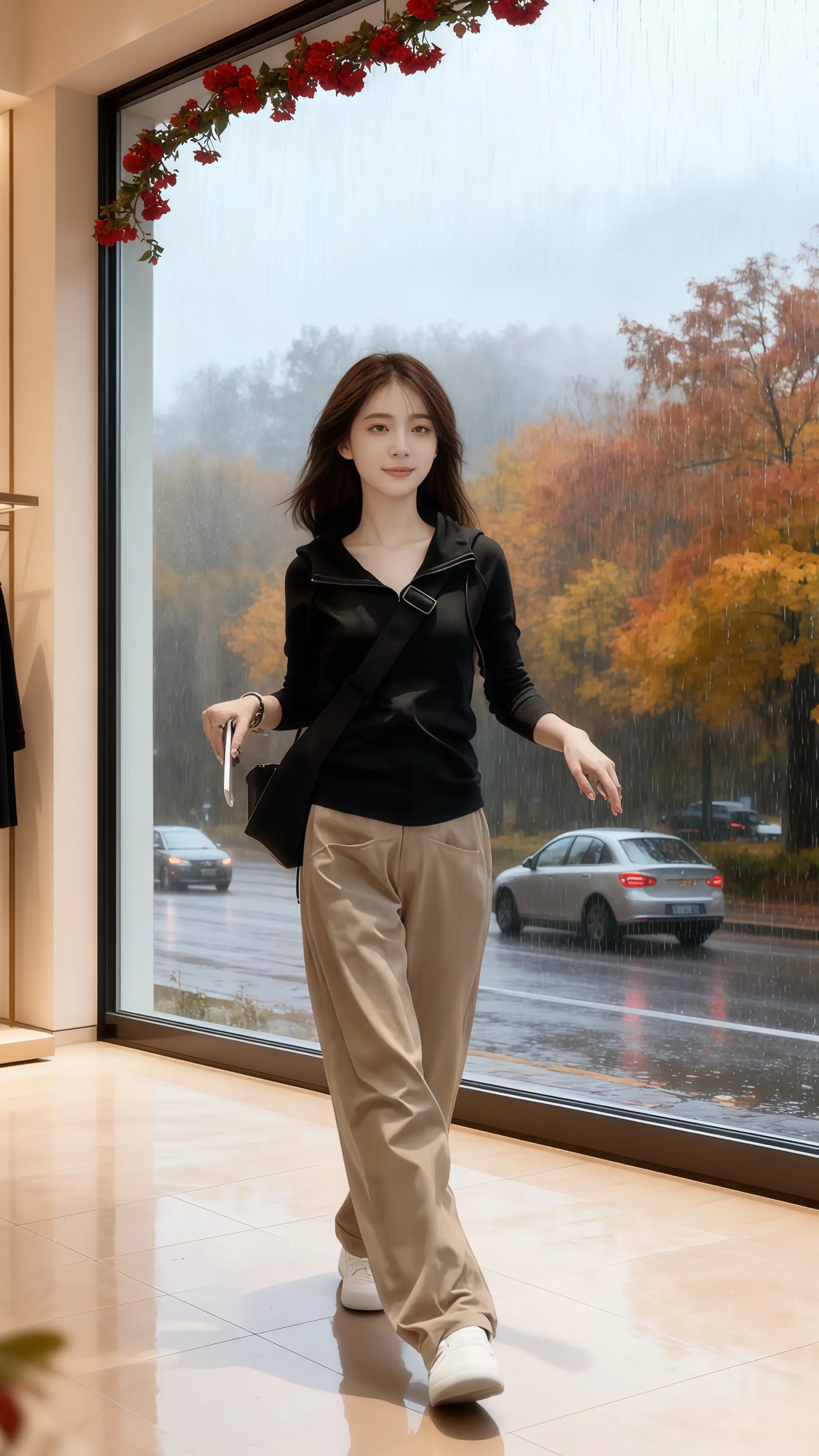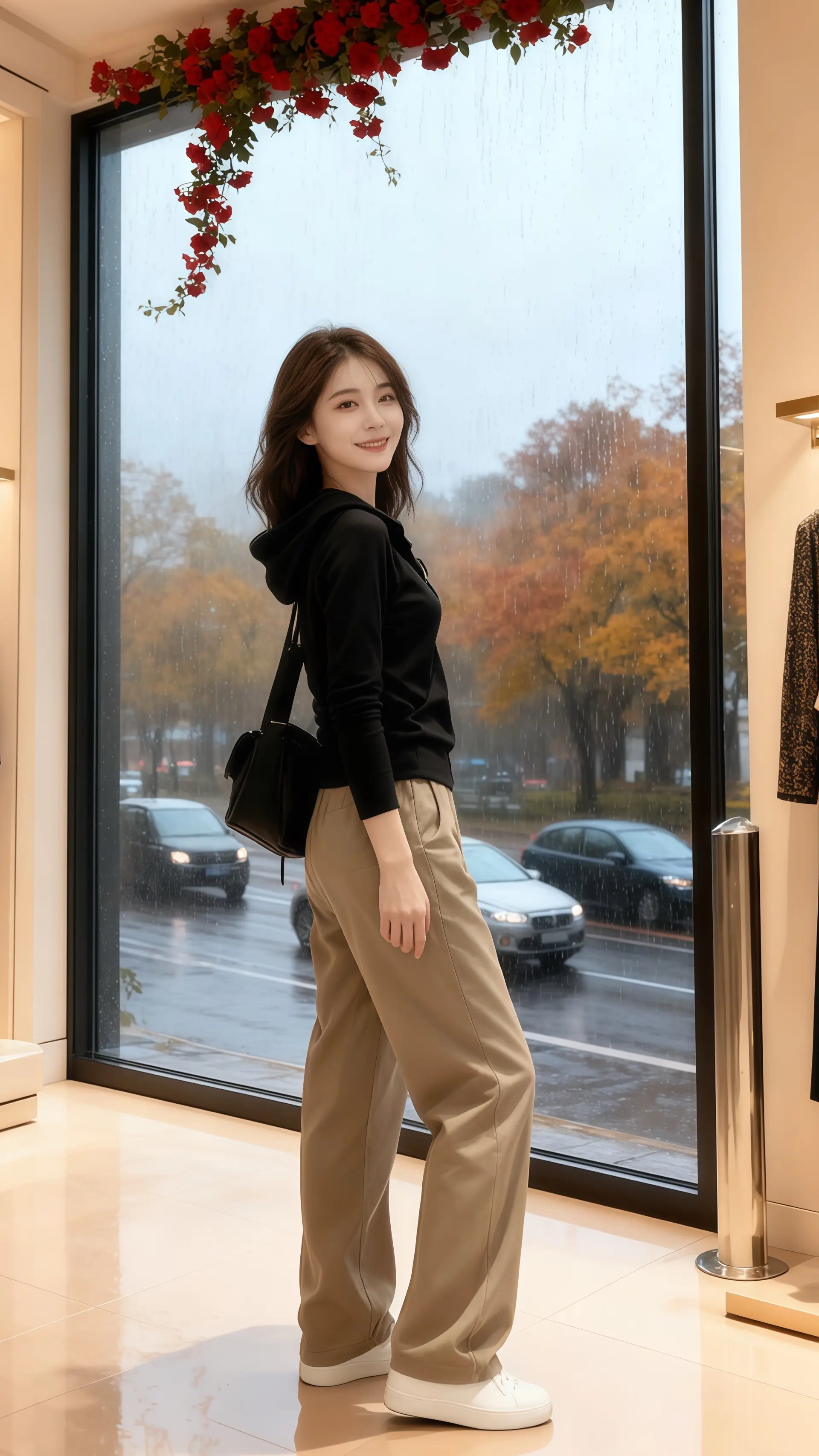 她穿着秋季卫衣弯刀裤两件套,在浅色系精品女装店的落地窗前,成了秋日里一道灵动的风景。黑色卫衣的设计感领口添了几分精致,浅卡其弯刀裤勾勒出随性腔调,适配所有秋日场景。窗外,朦胧秋雨打湿街道,几辆小车穿梭在泛黄的树影间,落地窗沿的红藤花在雨雾里愈发鲜活。她或抬手轻触衣料质感,或转身与同款穿搭的模特隔空呼应,每一个姿态都在诉说:这一身,是把秋日的慵懒与精致,都穿在了身上。来这里,让你的秋季衣橱,也有这般恰到好处的时髦温度。