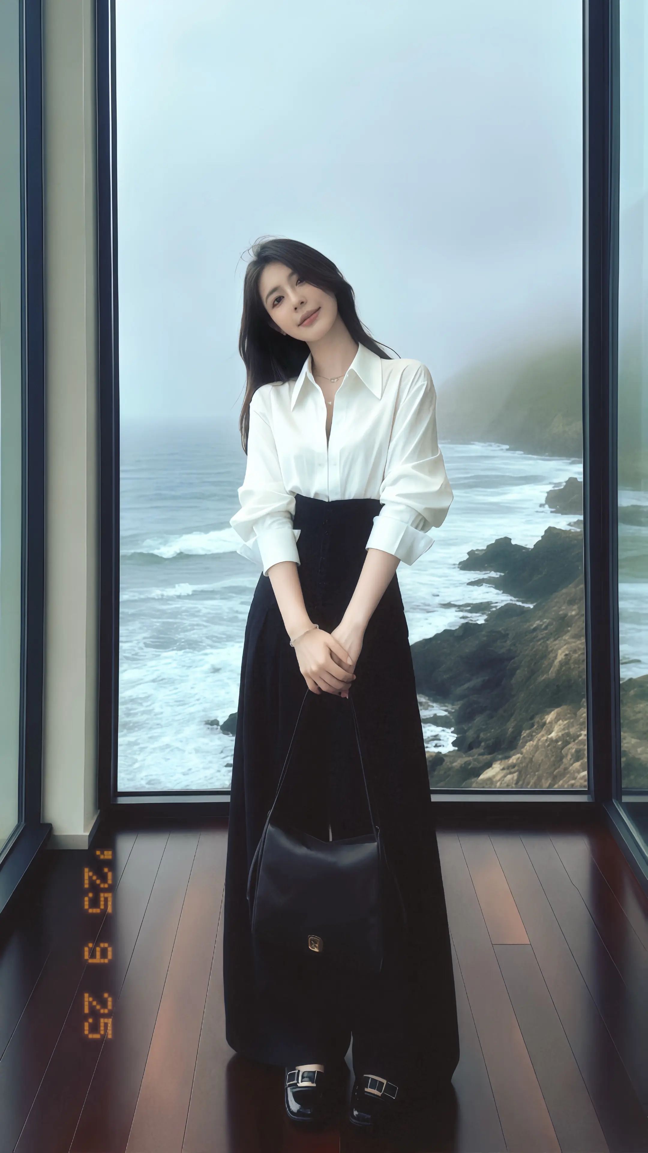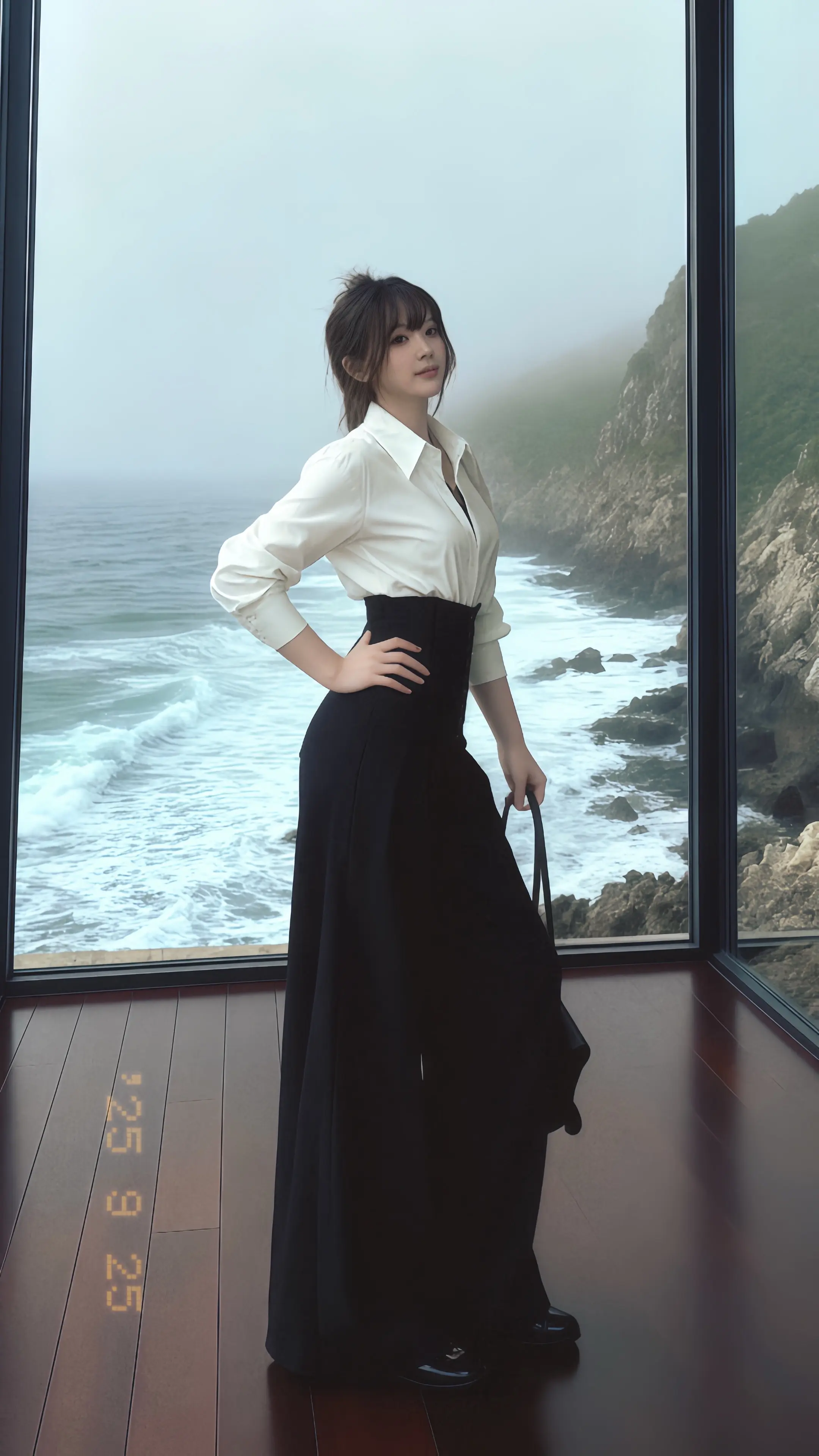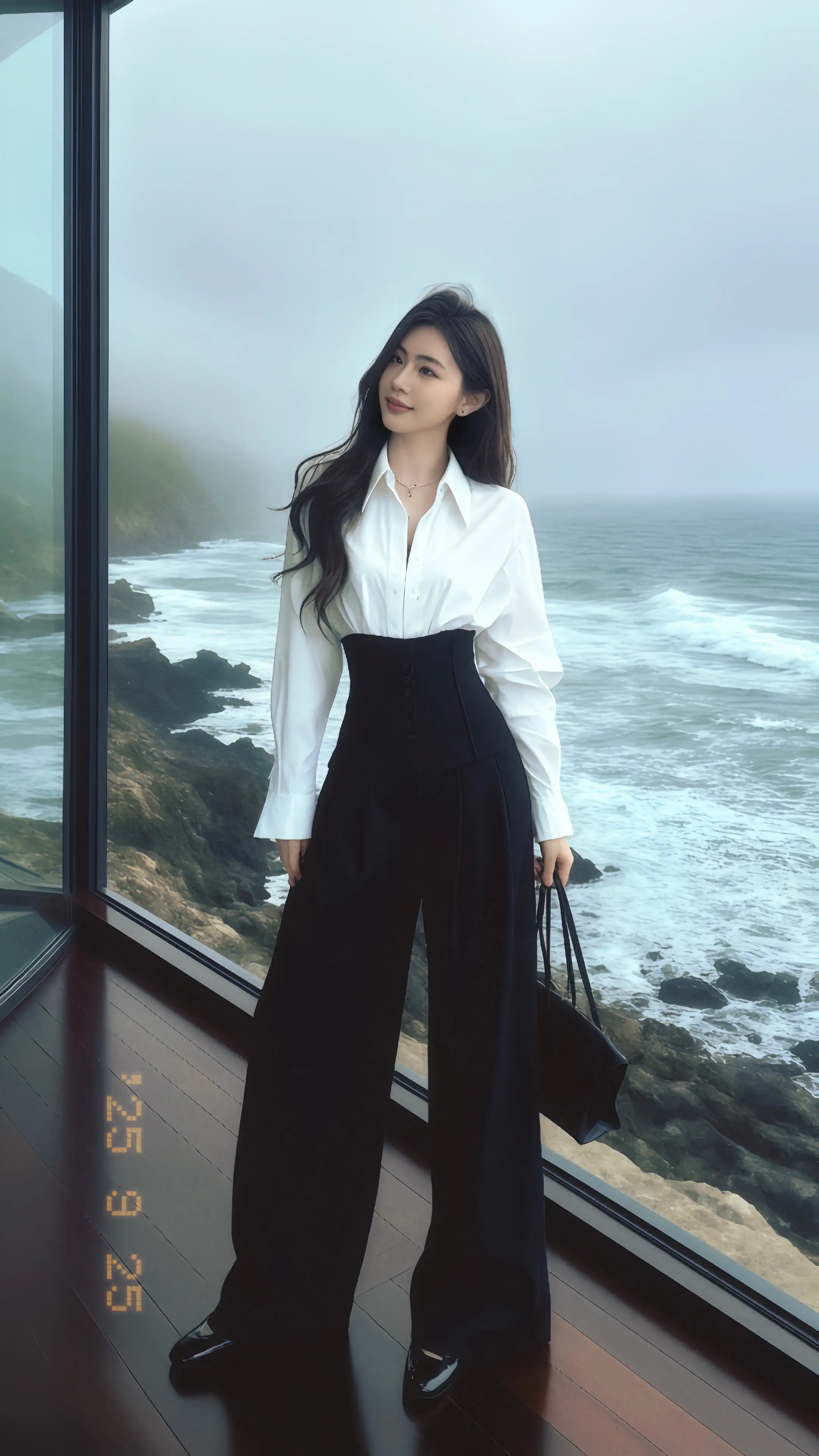 在江景房的落地窗前,她身着白色高级感衬衫与黑色西装阔腿裤两件套,于涛涛江水的映衬下,气质愈发卓然。衬衫的挺括质感尽显干练,阔腿裤的垂坠线条又添随性,每一处剪裁都似在诉说精致格调。当江风掠过,衣袂轻扬,她既是职场里的优雅精英,也是这江景画卷中,一抹自带高级感的灵动风景,将都市女性的从容与魅力,在水天一色间娓娓道来。