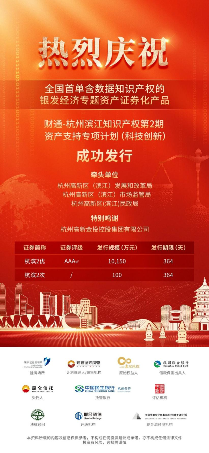 9月24日,杭州联合银行以保函增信方式参与的“财通-杭州滨江知识产权第2期资产支持专项计划(科技创新)”成功发行,该项目是全国首单含数据知识产权的银发经济专题资产证券化产品。