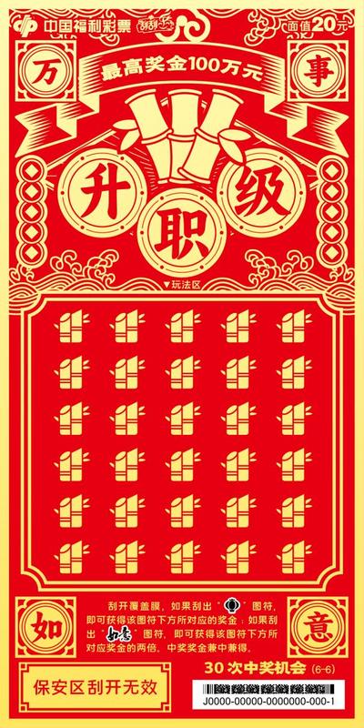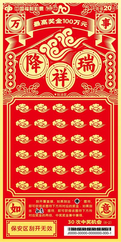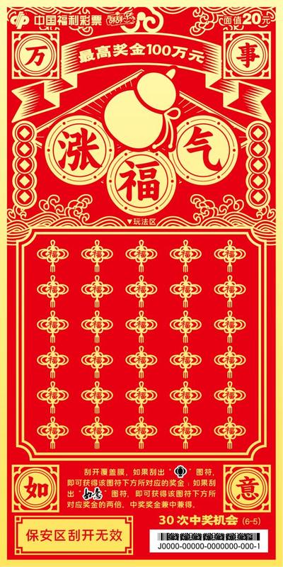 本套彩票共六张,画面简洁大气、喜庆吉祥,分别以“走财运”、“降祥瑞”、“添如意”、“旺桃花”、“涨福气”、“升职级”为主题,并加以传统吉祥纹饰相呼应。该套彩票采用中国红为背景,以金黄色的笔触为刻刀,运用中国传统剪纸风格刻画出人们对美好生活的向往。