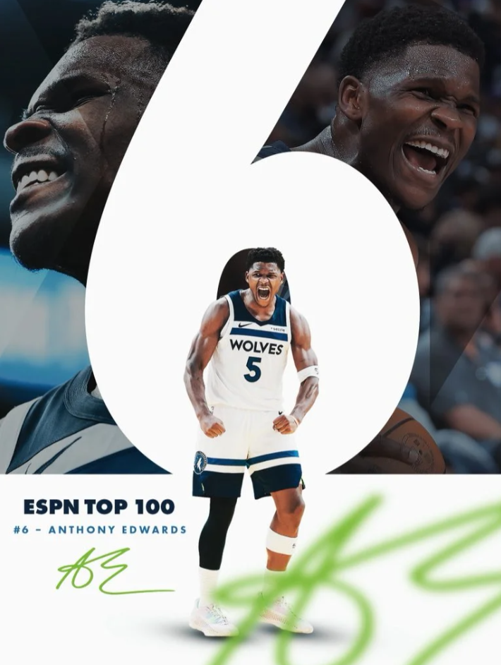 根据之前的报道,森林狼球员安东尼-爱德华兹排在ESPN最新一期百大榜单的第六位。
