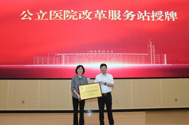 李红会长为福建医科大学附属第一医院代表、翁山耕书记授予“公立医院改革服务站”牌匾