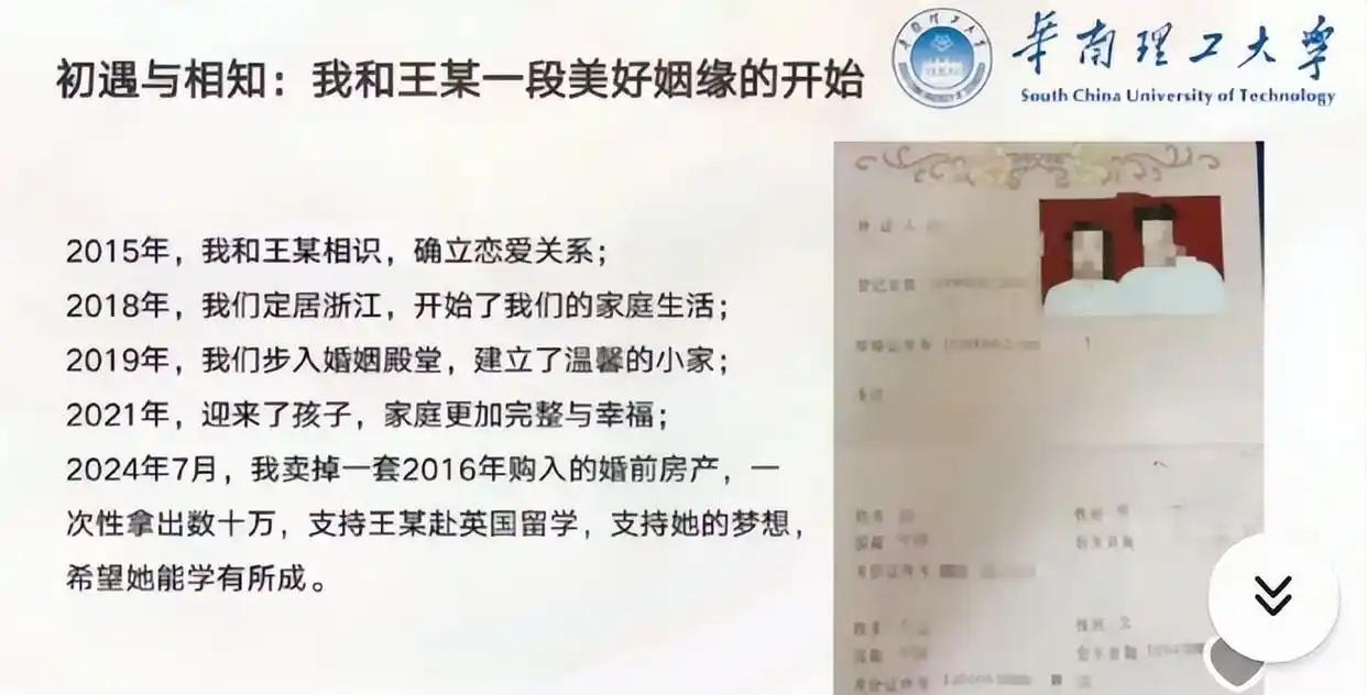 68页PPT曝光妻子出轨在读博士,没点文化,真容易吃哑巴亏啊! 9月25日,一名男子制作68页PPT曝光了妻子在国外出轨在读博士的各种细节,其中最炸裂的是妻子为此还染上了妇科病。 据这名男子讲述,自己和妻子王某已经结婚7年,有一个3岁的女儿,在2024年7月时,妻子想要去英国纽卡斯尔大学求学,男子为了支持妻子的决定,竟然以60万的价格卖掉了自己婚前购买的房子。 可没想到的是,妻子来到英国后,遇到了第三人黄某兴,他是公派到这个学校的在读博士,老乡见老乡,两眼泪汪汪,但这两人却过上了没羞没臊的同居生活,直到1年后,男主的妻子要回国,为了不被发现自己的丑事,她回国前把黄某兴的所有联系方式、照片、聊天记录都删除掉了。 可没想到这个黄某兴占有欲很强,没过多长时间,他也回国了,回国后又开始对男主的妻子疯狂骚扰,也不能说是骚扰吧,因为从一个细节可以看出,男主妻子也是很主动的,因为这个黄某兴在他妻子的家附近开了一个房间,整整十天,期间妻子每天都会去这个酒店约会。 最可笑的是,这个黄某兴居然要求女主别跟他的丈夫有身体接触,如果有,黄某兴发誓就不会理她,这应该算是一种病态了吧。 后来男子发现了妻子与黄某兴的丑事,本以为出轨就算了,没想到两人的不节制,最终还导致女子染上了妇科病,现在男子表态:正在考虑离婚。 评几句:别正在考虑离婚了,有些人,她一旦堕入黑暗,基本很难回头,家里有老公和3岁的女儿,自己却外出跟情人约会,就凭她这一点,这样的人就不值得珍惜,更何况她还染上了妇科病,难道让孩子一辈子都要背负这个阴影么,难道你能忍受这样的结果么,趁着孩子还小,早些断舍离,别让你的一辈子都会在这桩羞耻的婚姻中。