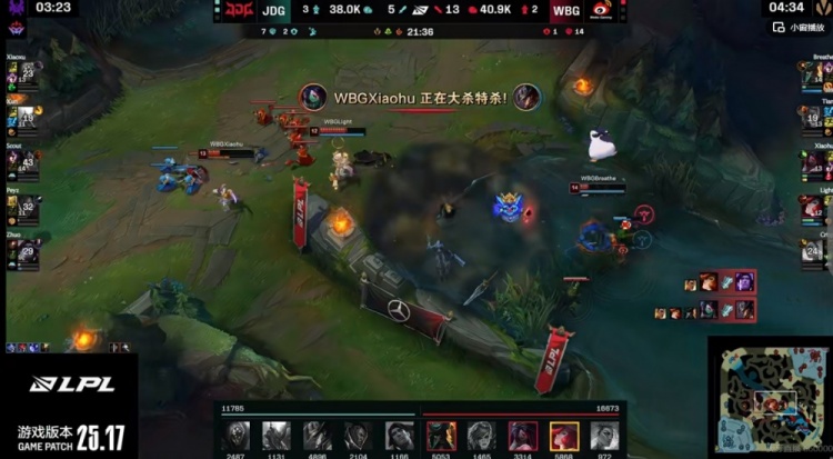 [23:11]WBG厄塔汗逼团,Xun潘森用命抢到了厄塔汗啊!但是正面Xiaohu阿卡丽残血开烟雾拉撤,正面Breathe船长带队追击!这波WBG又是2换4啊!还可以拆掉JDG的中下双二塔!3K经济差!