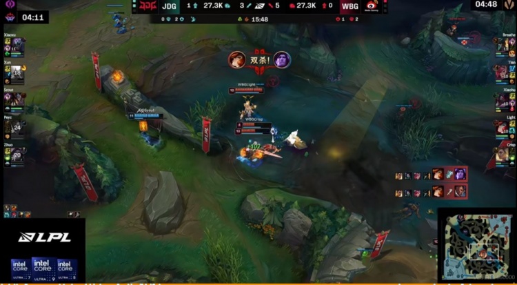 [12:32]JDG中野双大招飞下,四人越塔强杀掉了Xiaohu阿卡丽!JDG随后拆掉了WBG的下一塔!