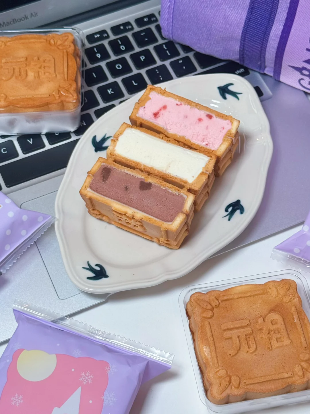 是谁买月饼还不忘来个测评,原来是我! 都说元祖雪月饼只有一次和无数次,这话还真的一点都不假。 吃腻了传统月饼,第一次尝就会被它独特的口感与丰富的口味所俘获。 外层是台式煎饼皮,满嘴香脆可口,搭配新西兰进口奶源做的冰淇淋,真的狠狠把我拿捏住! 下次还要买他们其他的月饼冰淇淋尝试,据说也很好吃! 这次就先买了【雪月饼】回来试试,一共有三种口味,算是我近期吃到zui惊喜的月饼了~ 巧克力巴旦木🍫242kcal/块 台式煎饼皮+47%鲜牛奶可可冰淇淋+黑巧生巧丁+巴旦木坚果碎 浓醇的可可裹着奶香炸开,口感层次直接拉满,巧克力脑袋狂赞! 草莓牛乳🍓223kcal/块 台式煎饼皮+39%鲜牛奶草莓冰淇淋+大颗糖渍草莓 咬下去酸甜草莓香混着奶香,奶fufu的像在嚼带果肉的草莓奶昔,清爽酸甜,吃完整个人都明媚了! 香草夏威夷果🌿218kcal/块 台式煎饼皮+58%鲜牛奶含量的冰淇淋+马达加斯加香草籽+澳洲坚果碎, 用料确实扎实,醇厚奶香裹着天然香草香,咬到夏威夷果仁“咔嚓”脆,甜而不腻,超奶的! 这波中秋限定的甜,外皮薄脆不硬,内馅绵密到像在啃云朵, 而且几次买的雪月饼都可以选装在实用的保温礼袋或者精美礼盒里,自己拿来做下午茶或者拿来中秋送朋友都很合适 现在全国元祖门店有770+门店,同城7公里内,2小时就能送达, 我都帮大家体验过了,他们的一条龙服务真的qiao方便的,下单马上就能安排!
