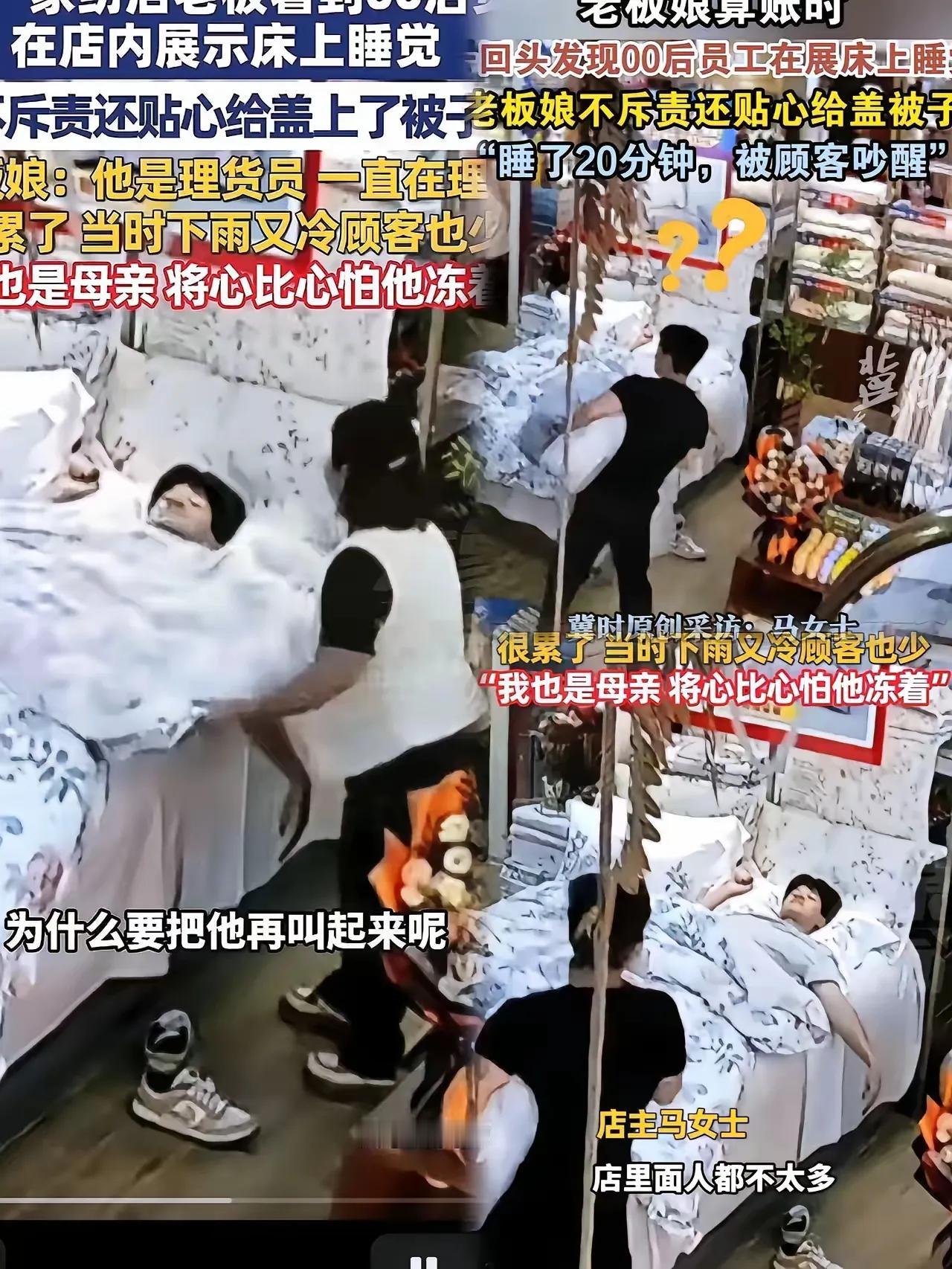 “想不发财都难!”河南,一名00后在郑州一家纺店当理货员,突然感觉干活有点累,想在店内展示床上躺一下,不料,竟在床上睡着了,结果老板娘发现后,不仅没有生气,甚至还贴心地给员工盖上被子,而老板娘接下来的一句话,更是让无数网友感到暖心!网友:难得遇到一位好老板! 事情是这样的,00后理货员估计是忙了一上午,整理床单被罩、叠展示样品,腰累得直不起来,想着在样品床上歇两分钟就起来,结果困意上来没绷住,直接睡着了。他睡着的时候,说不定还皱着眉,手里还攥着没叠完的枕套——年轻人刚上班,总怕自己偷懒被说,哪敢真的在店里睡大觉,这次实在是累过头了。 老板娘发现的时候,要是换了别的老板,说不定会觉得“员工上班摸鱼”,轻则说教两句,重则扣绩效。可这位老板娘没这么做,反而轻手轻脚拿了条薄被,小心翼翼盖在小伙子身上,怕吵醒他还特意放慢了走路的脚步。等小伙子迷迷糊糊醒过来,慌得赶紧起身道歉,老板娘却笑着说:“看你累得不行,多睡会儿没事,活儿不急,身体先歇好。”就这一句话,比给加班费还让人觉得暖。 有网友表示:最主要的应该是该员工平时的工作表现不错,老板娘才会看在眼里,记在心中,如果该员工是好吃懒做之徒,老板娘肯定以此为由炒他了。有爱的老板娘,不发财都难[赞][赞][赞]老板娘给这位员工盖好被子后,恰好来了一家四口也站在了床边,老板娘急中生智就像这一家四口介绍说看看这床多舒适呀![呲牙]这位小伙亲身体验一会儿就睡着了[呲牙]然后老板娘又对这一家四口介绍说:假如你们买的我们的床上用品一套四件套我们有很好的优惠[呲牙]这一家四口看着在床上熟睡的小伙肯定的点点头,这一家四口里小女孩忽然说这个大哥哥睡的好香啊!小女孩的妈妈说好吧老板我们就买你说的四件套吧[呲牙]有这样有人情味的老板,那个员工不会再偷懒,人心换人心,知遇之恩是人生一种福气。广告语:可舒服了,睡得老香了![看]天下老板都好。有些员工你对他好,有时他认为应该,员工应该知恩图报,对的起自己的工作好好干。天下老板都是干出来的,员工干好干不好老板心里最有数。这位老板娘确实是有人情味的暖心人。她能够体贴理解员工,员工也一定会更加努力的工作,回报老板娘的关爱。这就是老板娘的高明之处。 大家怎么看呢?