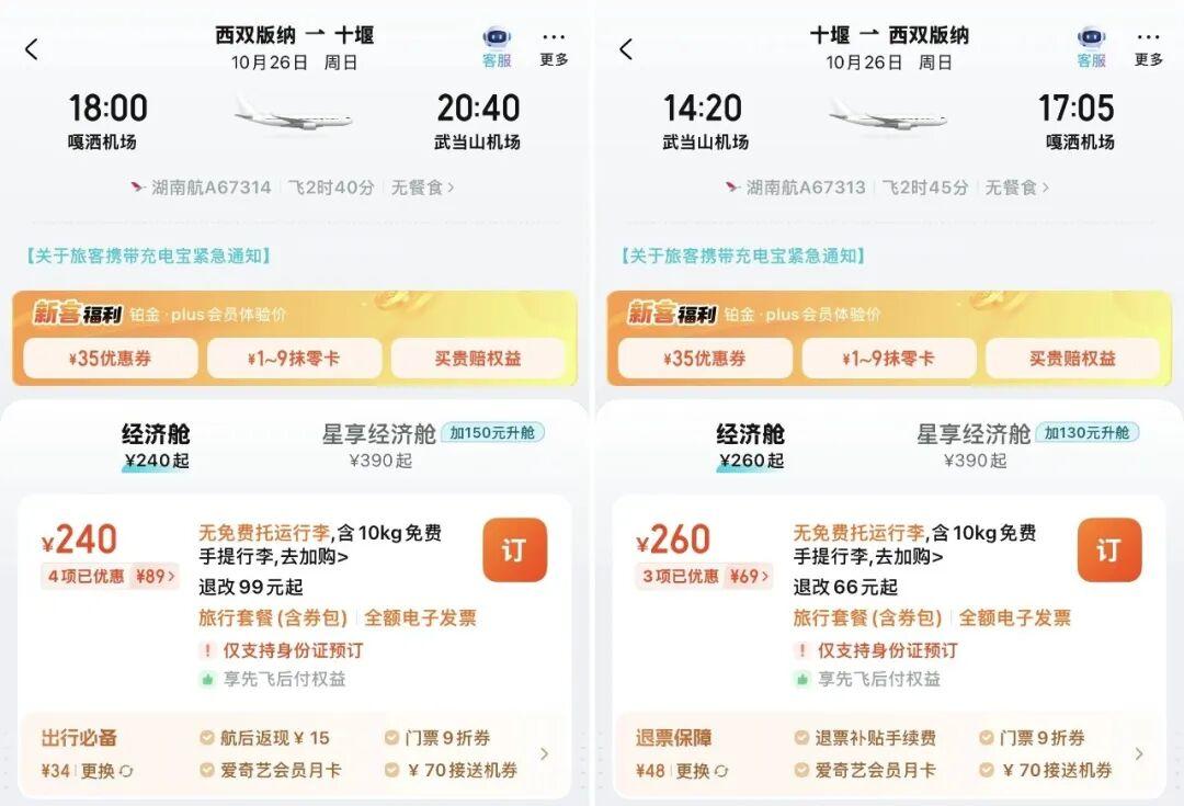 航班时刻以实际查询为准,小编登录旅游APP查询了十堰往返这两地的机票价格。