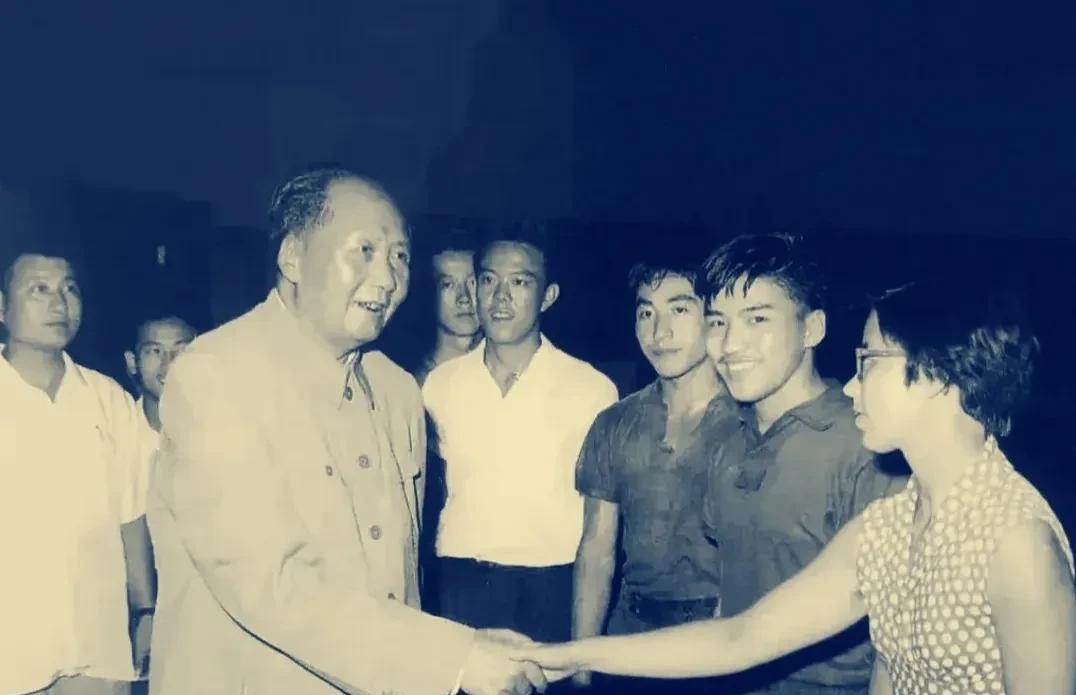 1959年5月6日晚中南海,毛主席与乒乓球运动员和教练员邱钟慧、廖文挺、庄则栋、