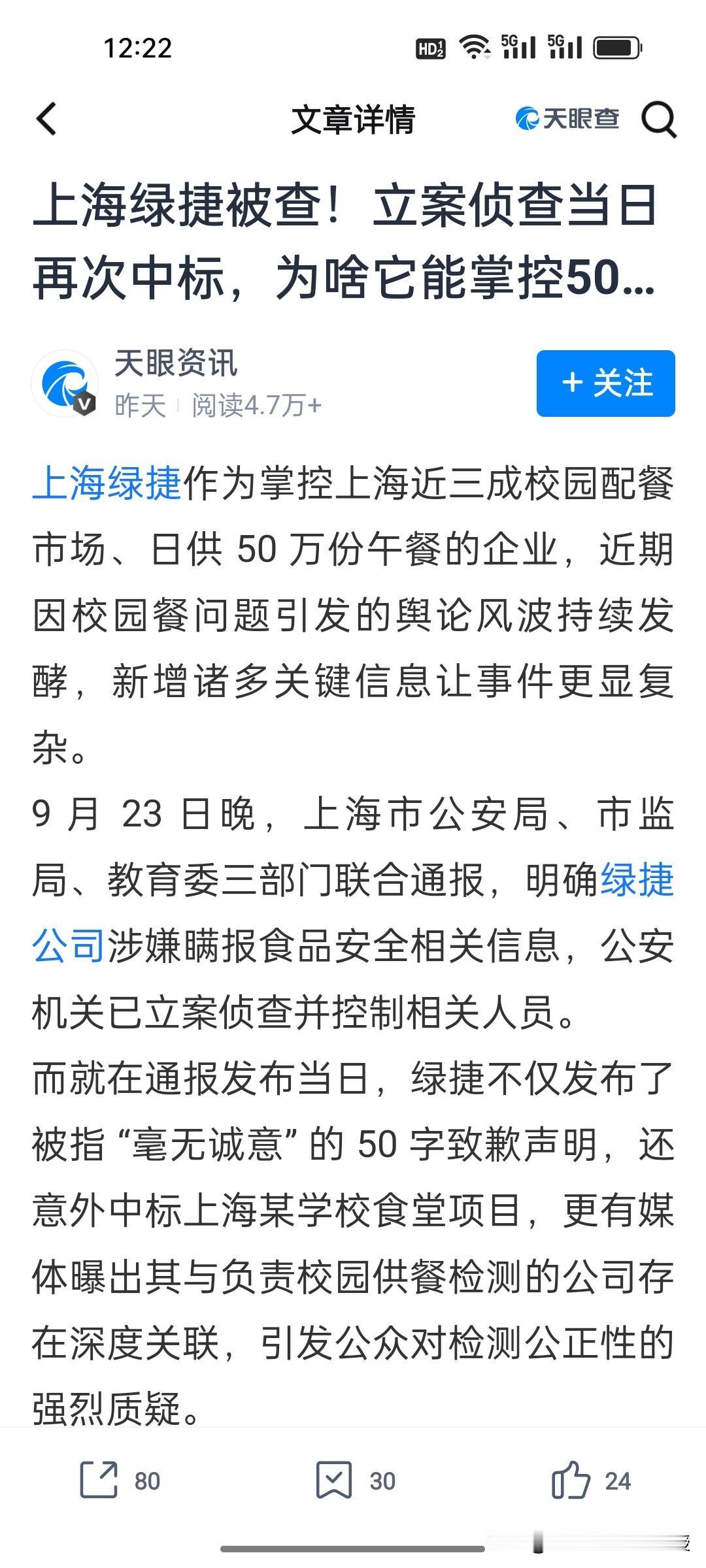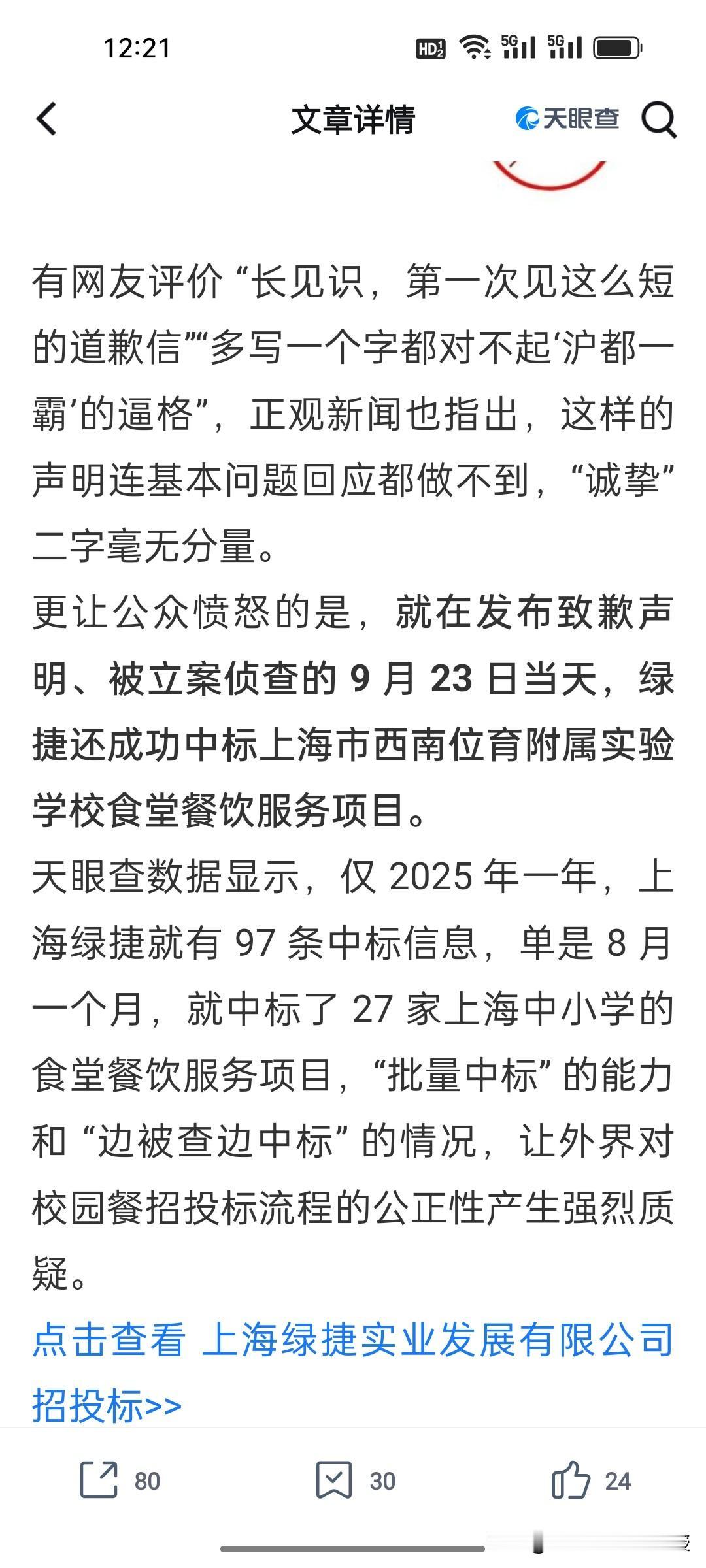 道歉当天还能继续中标?根据《天眼资讯》报道,就在绿捷公司发布47字致歉声明以及被上海市公安局立案调查,实控人被控制的 9 月 23 日,绿捷还成功中标上海市西南位育附属实验学校食堂餐饮服务项目,这是一家徐汇区的九年一贯制学校,有36个班级,按照每个班40人来算,绿捷又将要为1440名学生提供午餐,不知道这所学校的家长看到这条刚刚中标的信息后有何感想,按照一餐5元利润算,这个学校一年的利润就有130万。 正常来说,一家被立按调查的公司应该暂停招投标流程,在调查结果出来后再定夺有没有继续招投标的资格。《新华社》和《新京报》之前发文提出质疑,称“屡遭投诉屡中标”这个核心问题要向公众解释清楚,就目前来看,还没等解释清楚,这不,又中标了。