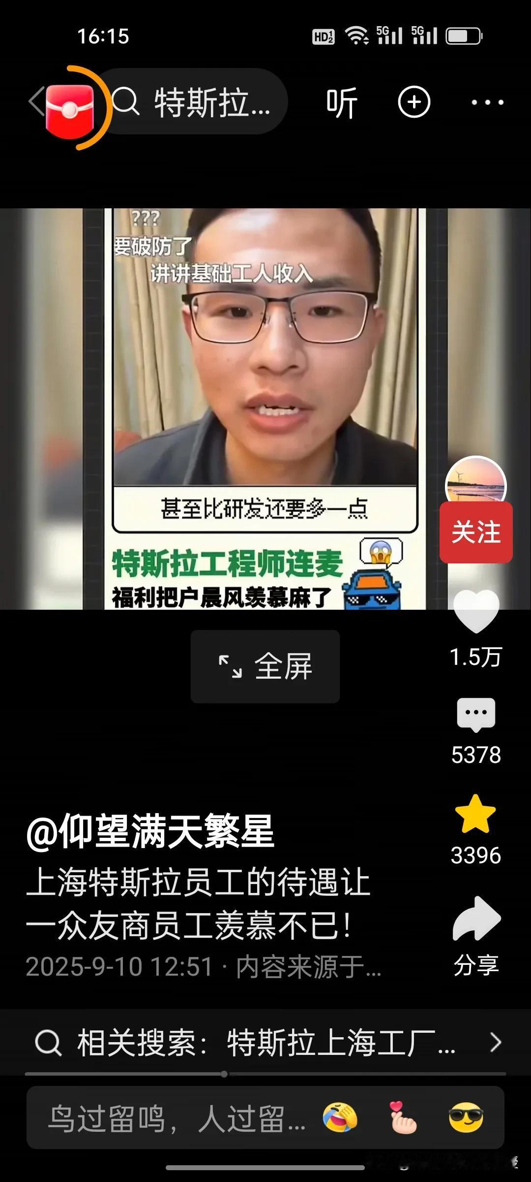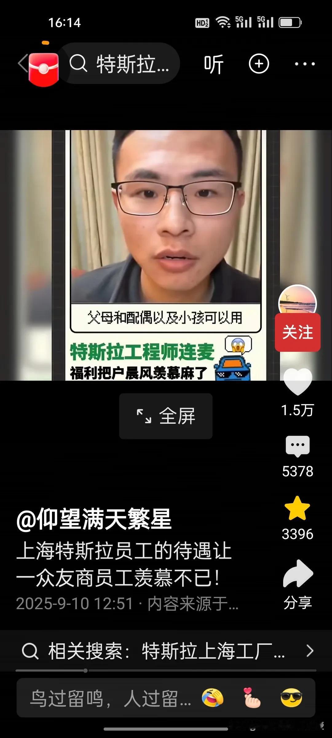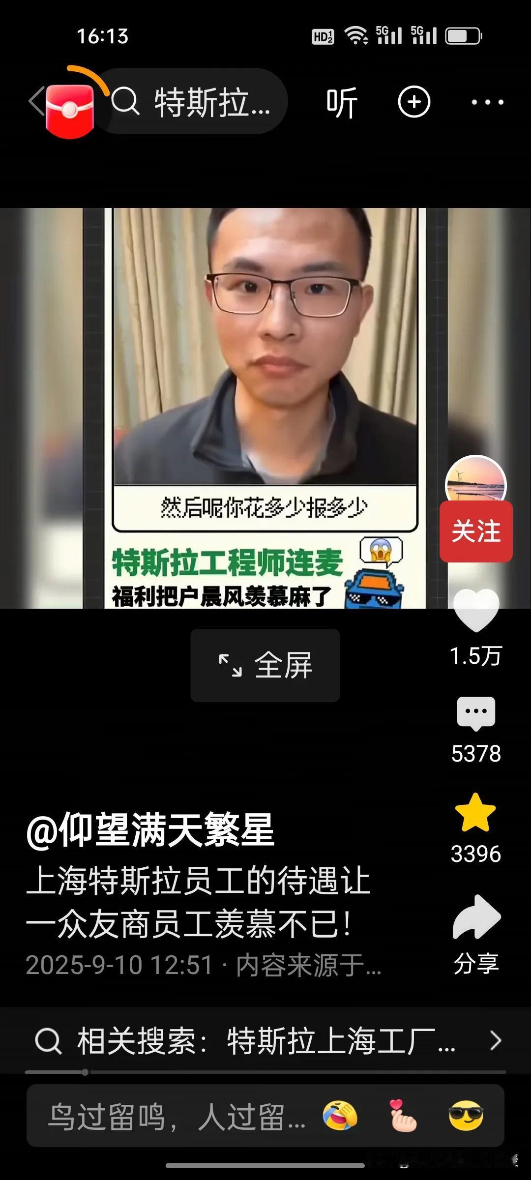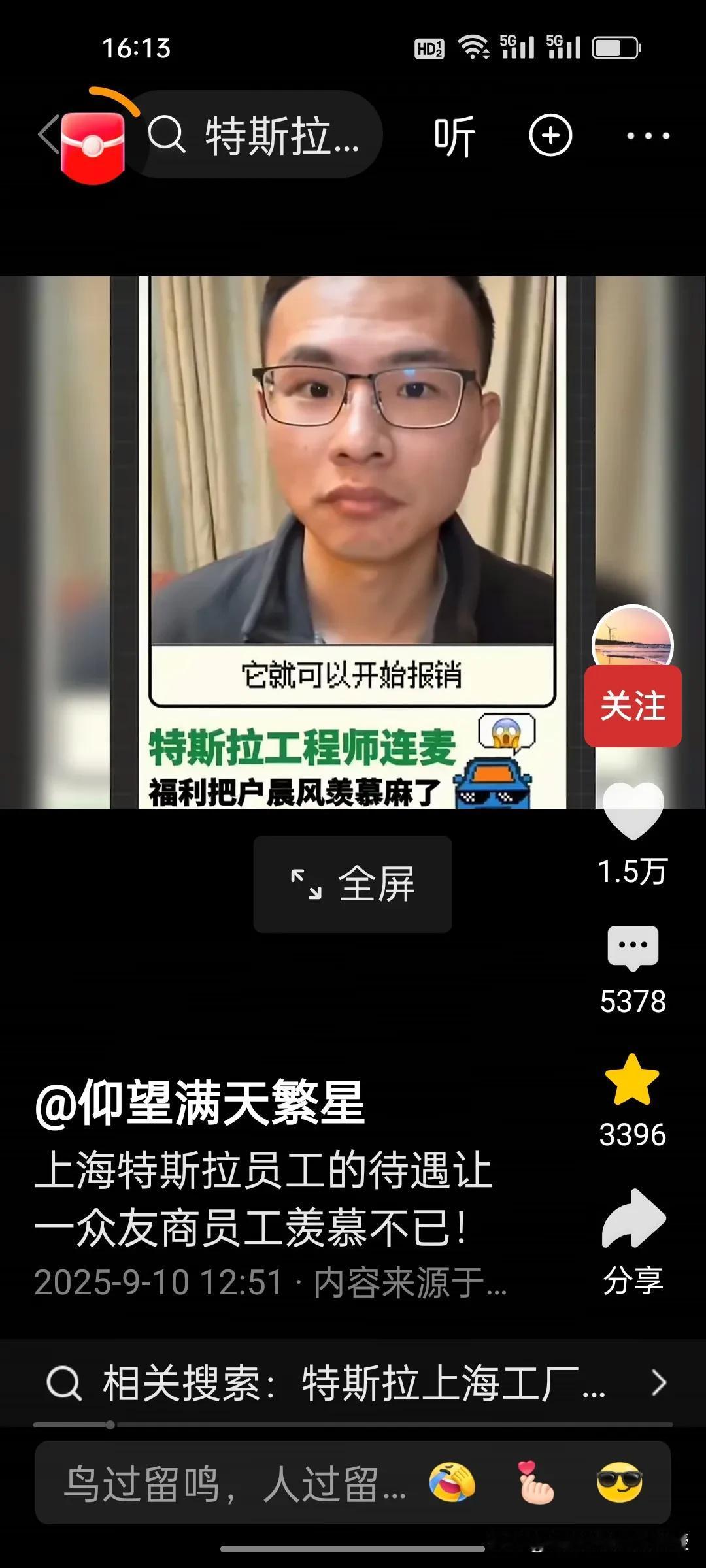 刚刚看到一位24岁的特斯拉研发工程师分享他在特斯拉的工作见闻,大家看看是不是属实?要是真的话,那着实让其他车企“拧螺丝”的小伙伴羡慕不已啊! 工资及福利:包含股票在内30-40万/年。公积金补到12%,加上一个高端医疗商业险,家人也可以用,医院消费100元以上就能全部报销,这种险的价格基本上在每年600元以上。工人的福利比白领多,能优先选择低价的廉租房。节假日的福利多,工人的工作餐免费,还有加餐两顿。 工作时间:一周待够40小时就行,没有强制的每天8小时,每天工作八小时包含吃饭时间,是比较弹性的工作时间。 工作感受:氛围感好,领导没有架子。 休假:每年除了法定节假日之外,还有12天年假,刚入职就有。 招聘要求:主要看能力。被采访的小伙子是211本科,还有普通本科的同事,不是唯学历录用。