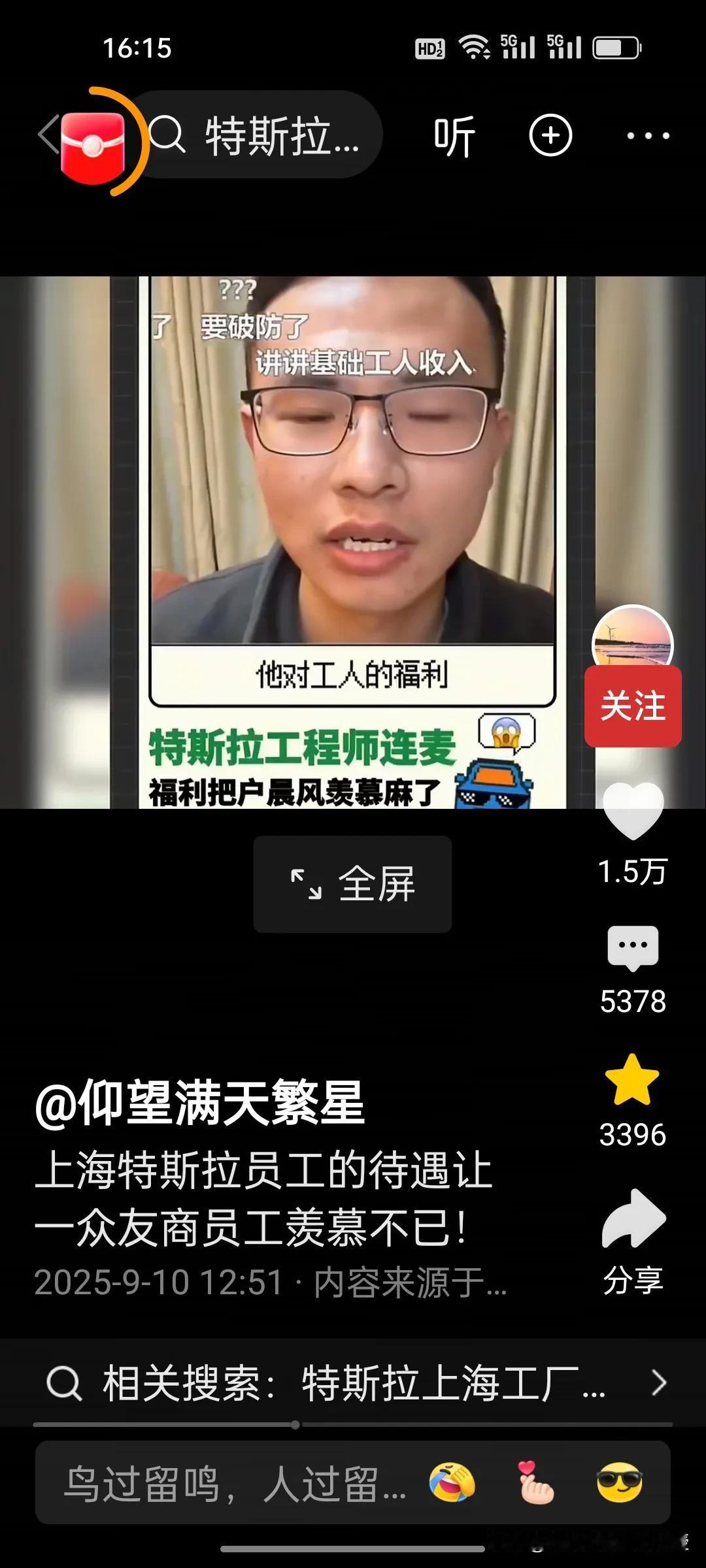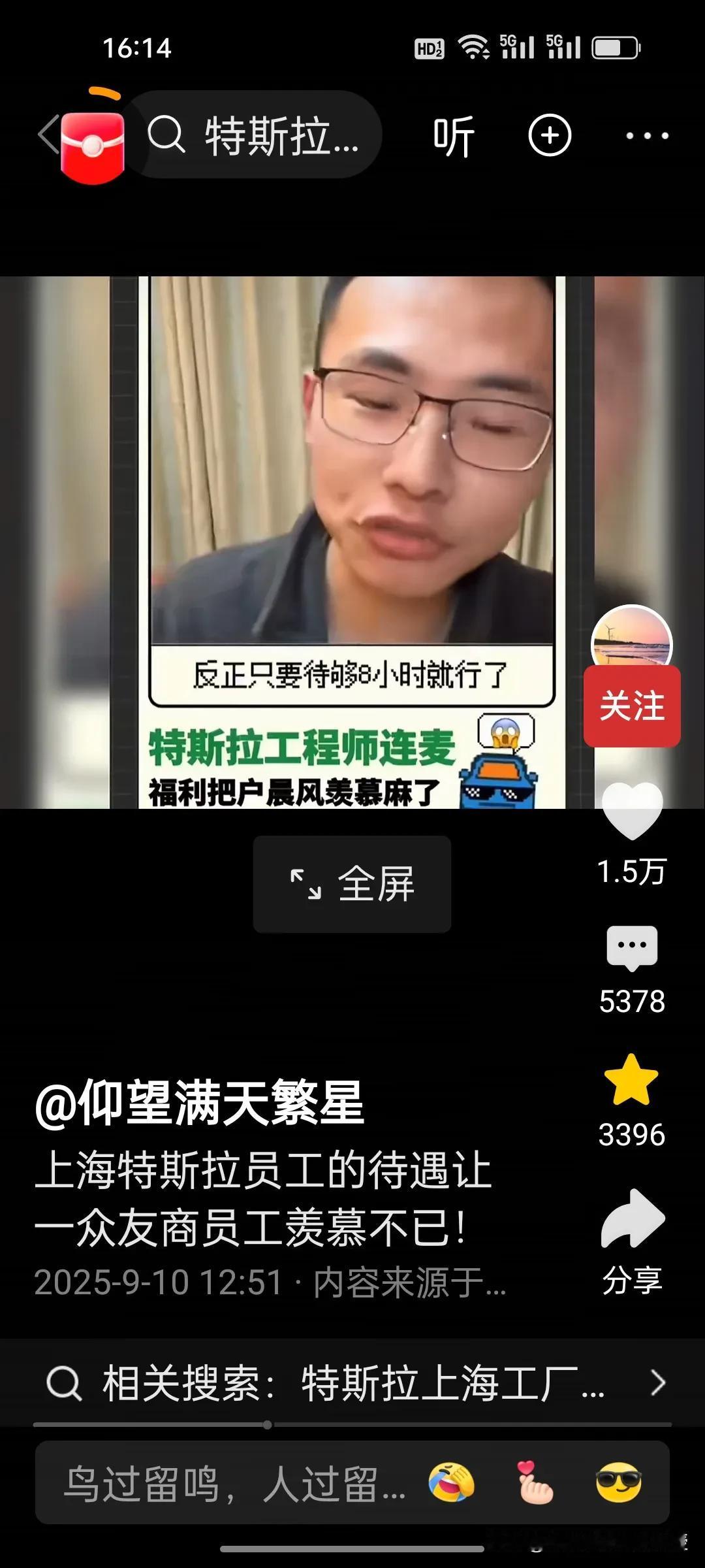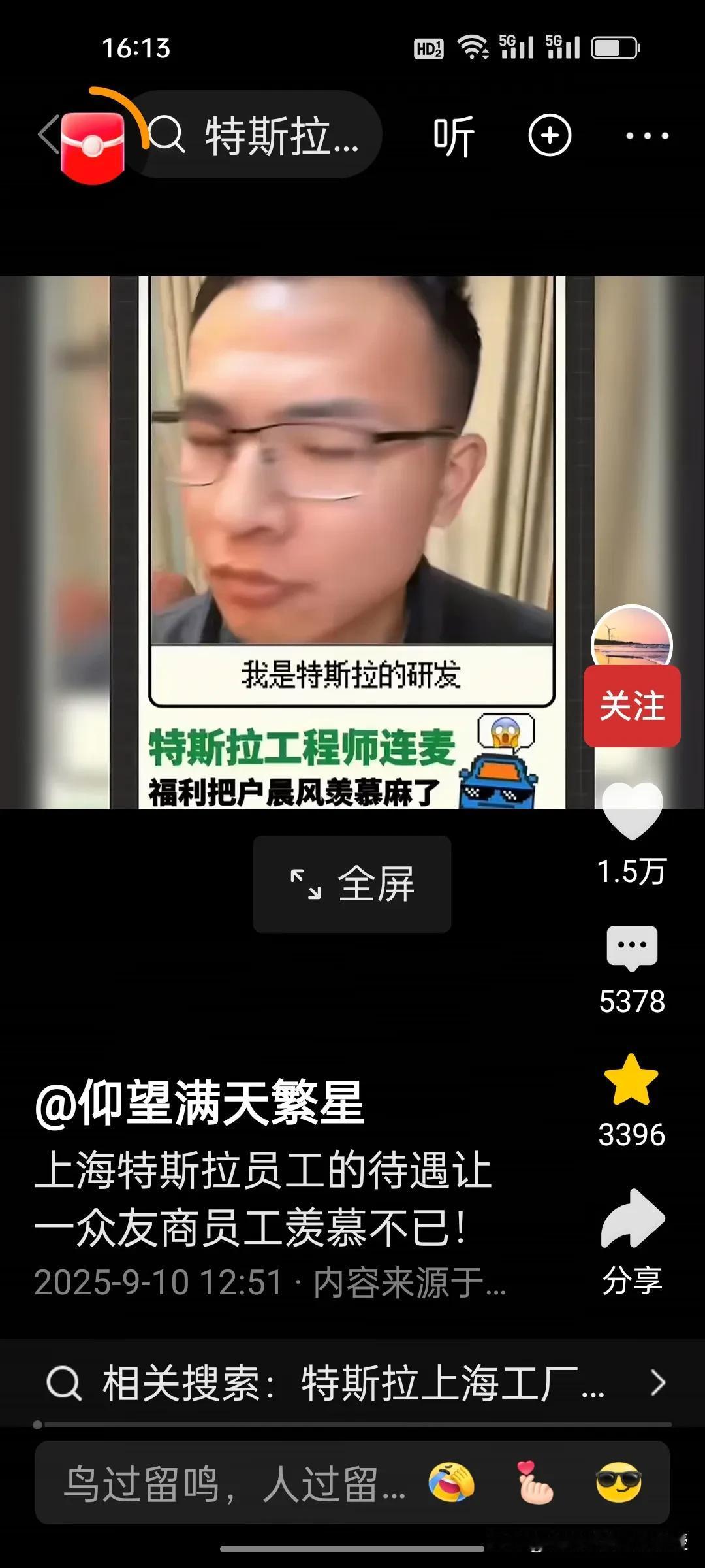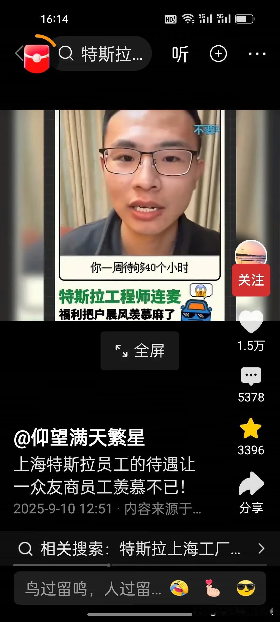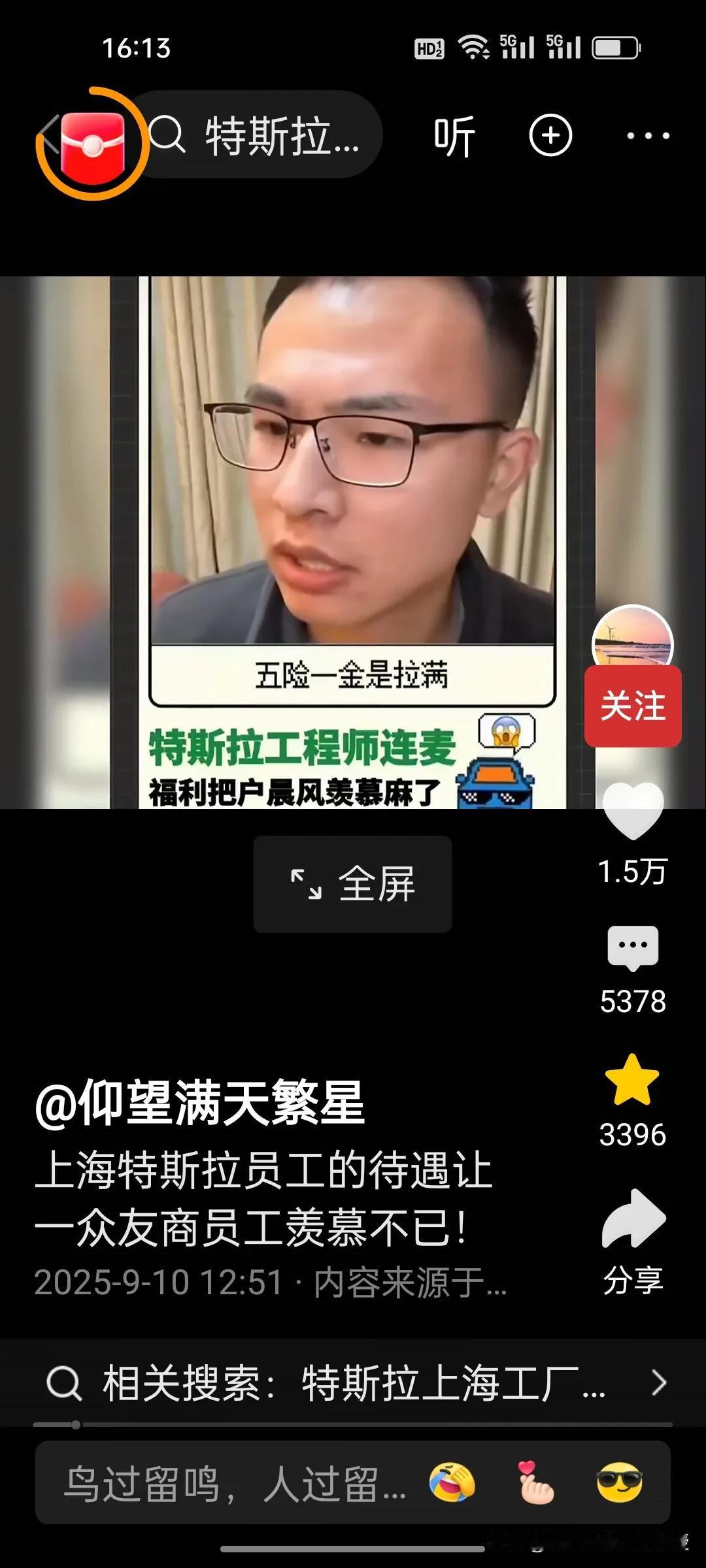 刚刚看到一位24岁的特斯拉研发工程师分享他在特斯拉的工作见闻,大家看看是不是属实?要是真的话,那着实让其他车企“拧螺丝”的小伙伴羡慕不已啊! 工资及福利:包含股票在内30-40万/年。公积金补到12%,加上一个高端医疗商业险,家人也可以用,医院消费100元以上就能全部报销,这种险的价格基本上在每年600元以上。工人的福利比白领多,能优先选择低价的廉租房。节假日的福利多,工人的工作餐免费,还有加餐两顿。 工作时间:一周待够40小时就行,没有强制的每天8小时,每天工作八小时包含吃饭时间,是比较弹性的工作时间。 工作感受:氛围感好,领导没有架子。 休假:每年除了法定节假日之外,还有12天年假,刚入职就有。 招聘要求:主要看能力。被采访的小伙子是211本科,还有普通本科的同事,不是唯学历录用。