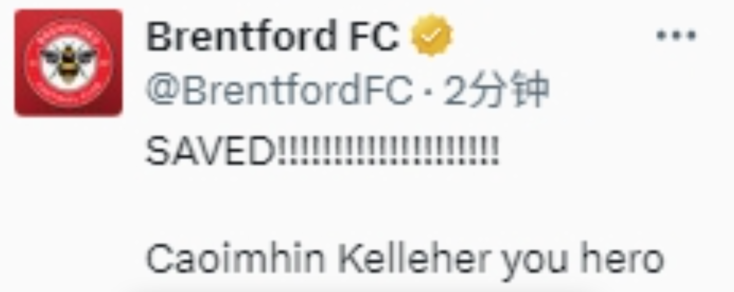 布伦特福德官推称赞凯莱赫:扑出来了!你是英雄!