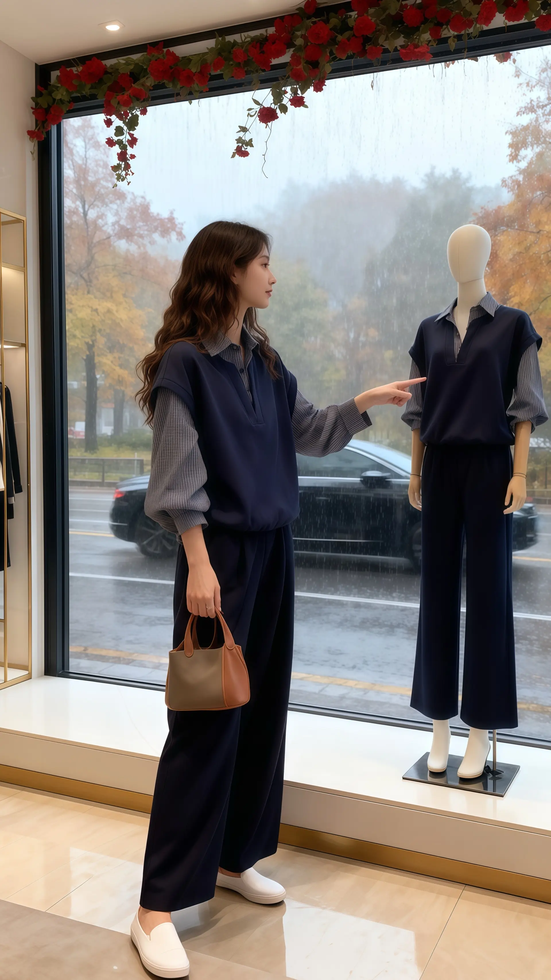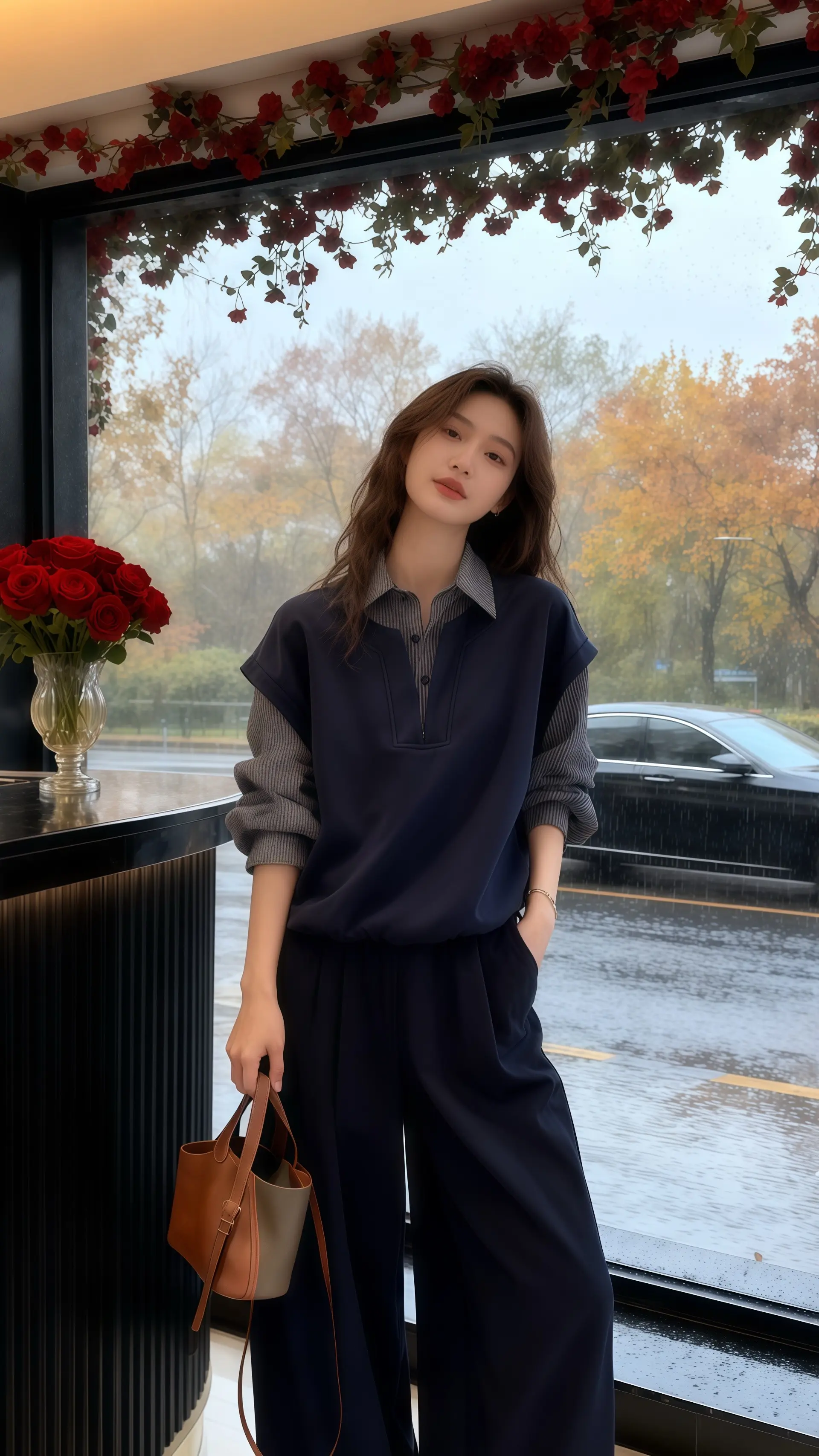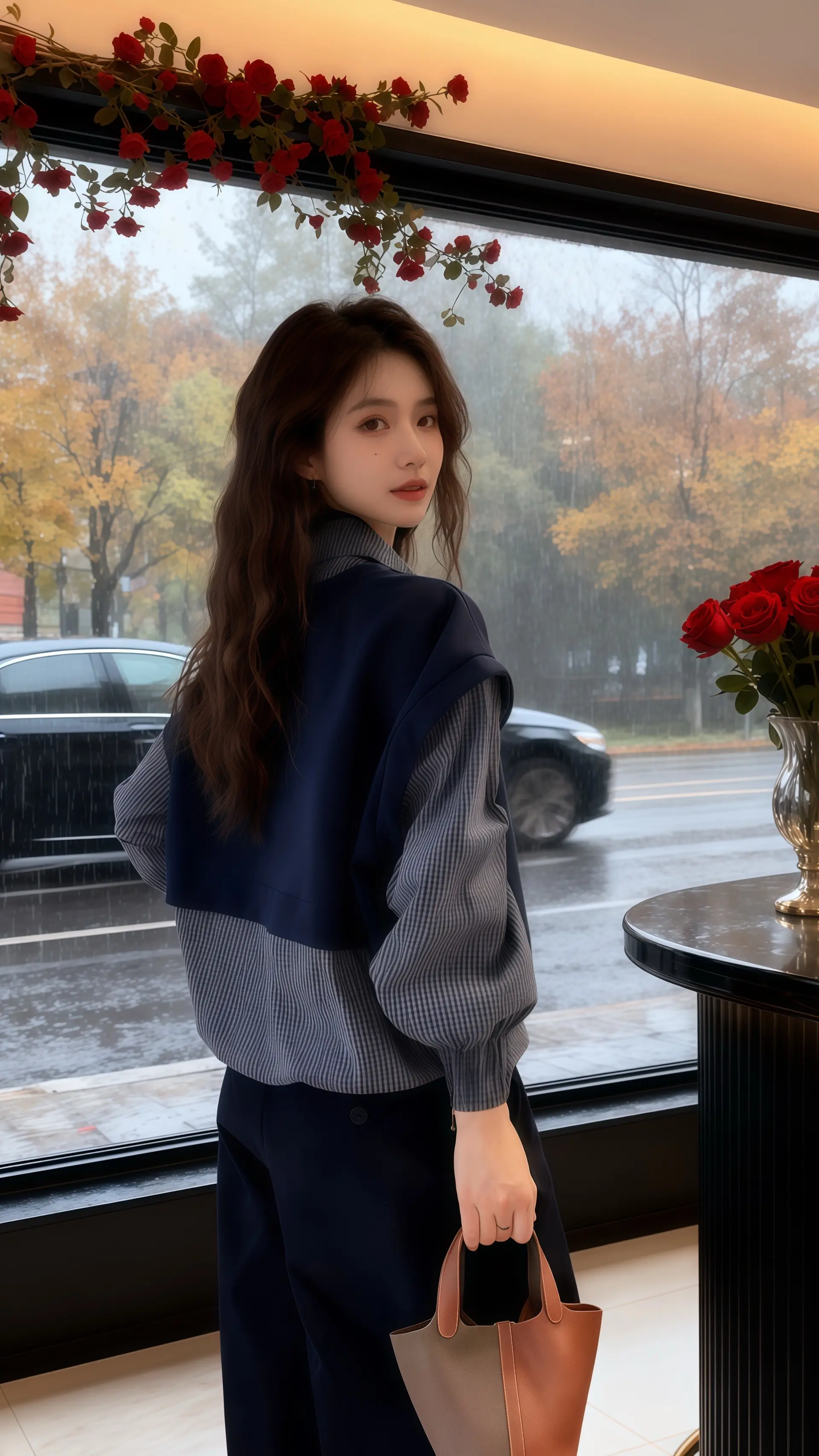 她穿着一件气质拼接格子衬衫,藏蓝色基底与清晰格纹碰撞出高级质感,精心保留的袖口细节更显穿搭巧思。身影立于高档女装店落地窗前,暖光漫过肩头,与身后暗调轻奢吧台形成温柔对比,台上花瓶里的红玫瑰正凝着雨意。窗外秋雨朦胧,染黄的枝叶轻晃,一辆黑色汽车驶过湿漉漉的街道,窗顶红色花藤垂落几分鲜活。衬衫的利落与雨天的柔润相融,在店内外的光影交错间,定格成秋日里最动人的穿搭范本,每一处细节都藏着对生活的精致注解。