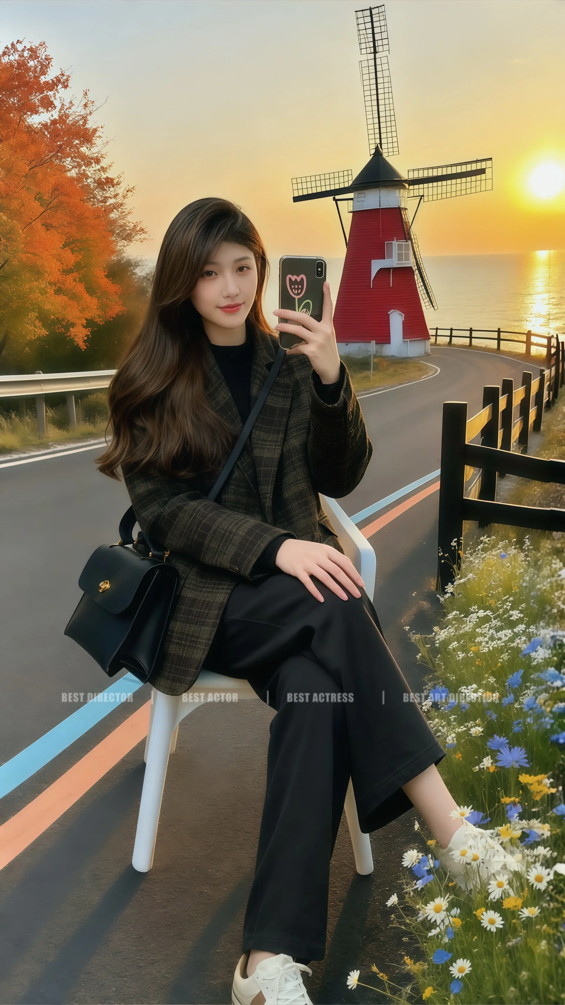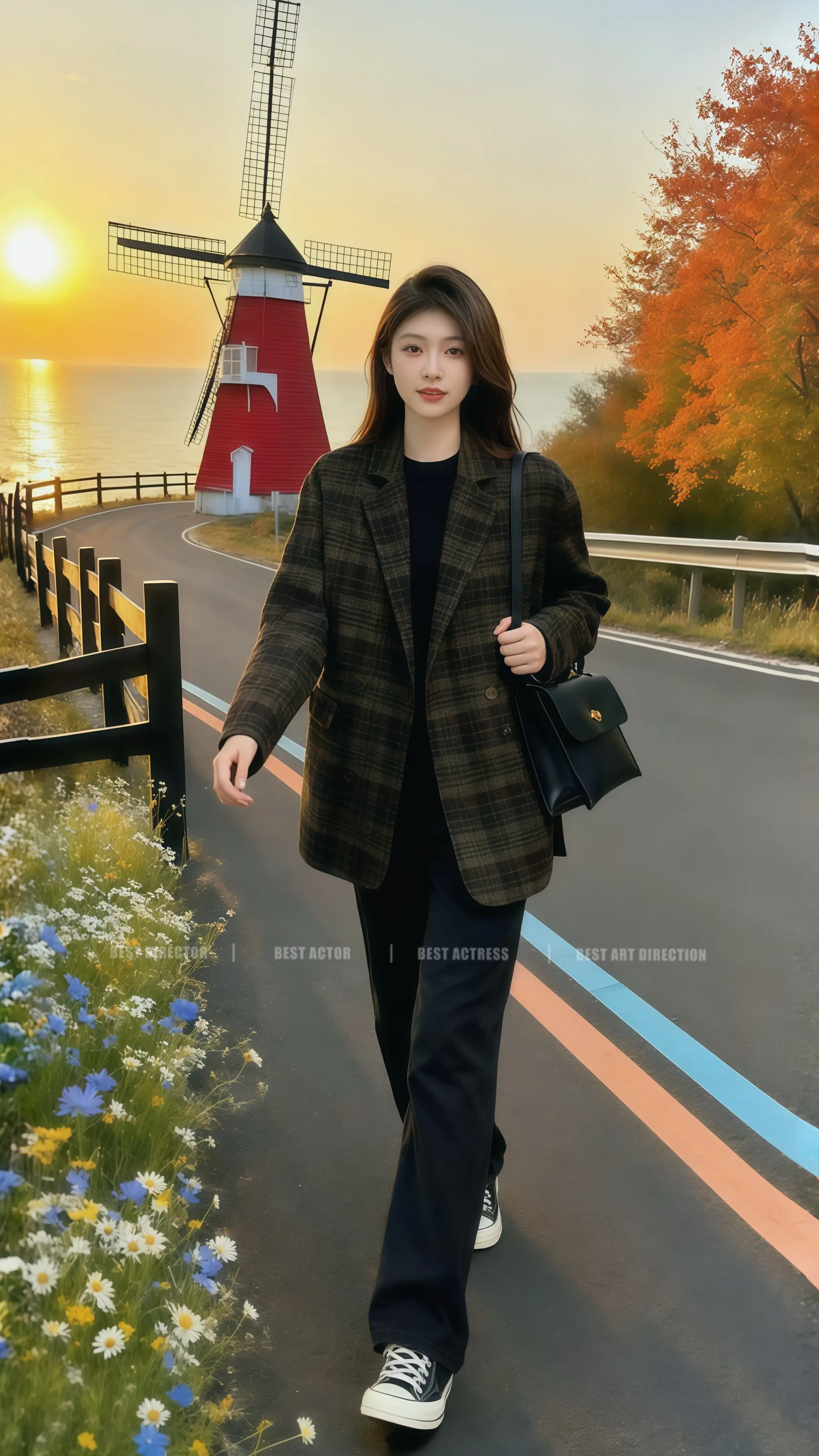 她穿着复古小香风格子西装外套,棕咖格纹交织出浓郁的复古韵味,金色纽扣在灯光下泛着精致光泽,内搭黑色针织衫更显层次感。在充满高级感的女装店里,她指尖轻触同款格纹西装的假模特,落地窗外是夕阳晕染的天际,红色风车在余晖中缓缓转动,马路边蓝白雏菊随风轻晃。当她转身时,外套下摆掠过陈列架,每一处格纹都像是从旧时光里裁剪出的优雅,把女装店的精致与窗外的浪漫,都揉进了这一身复古穿搭的风情里。