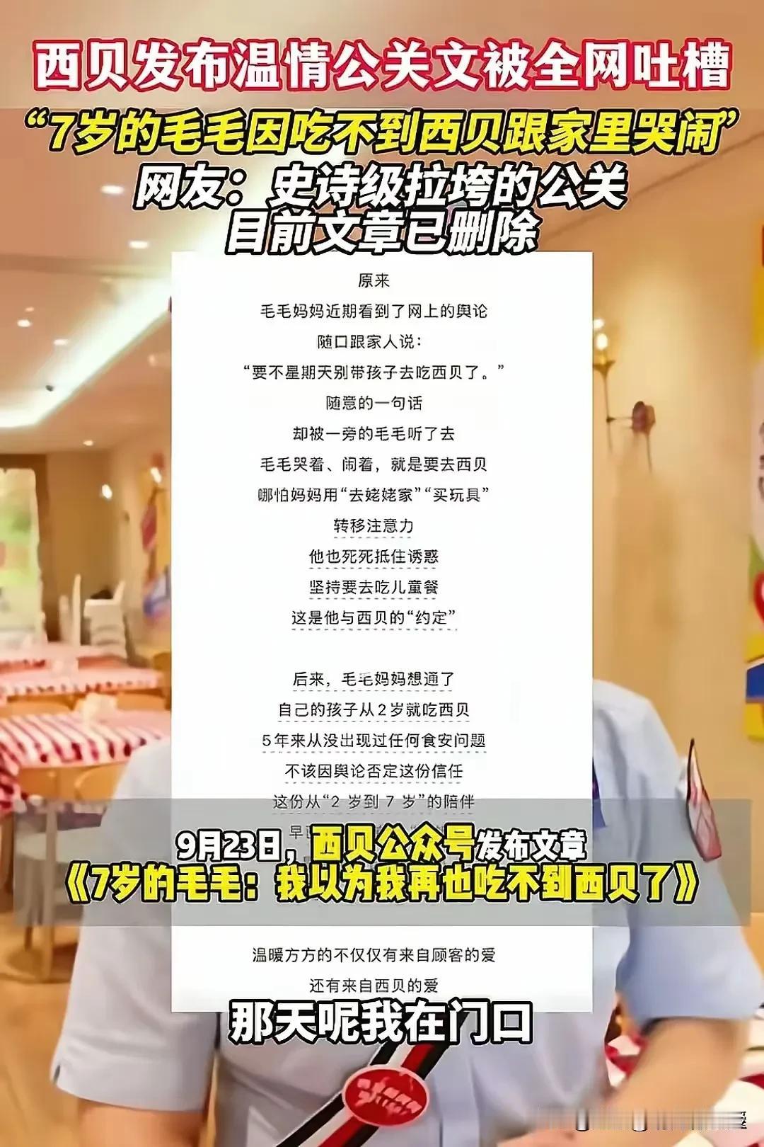 当大家都在强烈吐槽西贝的温情公关稿时,我倒觉得西贝在短剧市场上可能会有一番作为。 第一集《吃不到西贝痛哭的七岁毛毛》 第二集《北京大爷喝了西贝汤要送店长一套房》 第三集《不到1岁的宝宝在西贝学会吃饭》 这几集的中心思想就是:没西贝你们就吃不上好饭。 西贝要是乘势而上,拓展短剧新赛道,找个好编剧,趁着热度高,还真有可能干出行业龙头,参考海尔,不但卖家电还做动画片《海尔兄弟》。所谓东边不亮西边亮,西贝店里流失的客户在短剧市场上通通找回来。