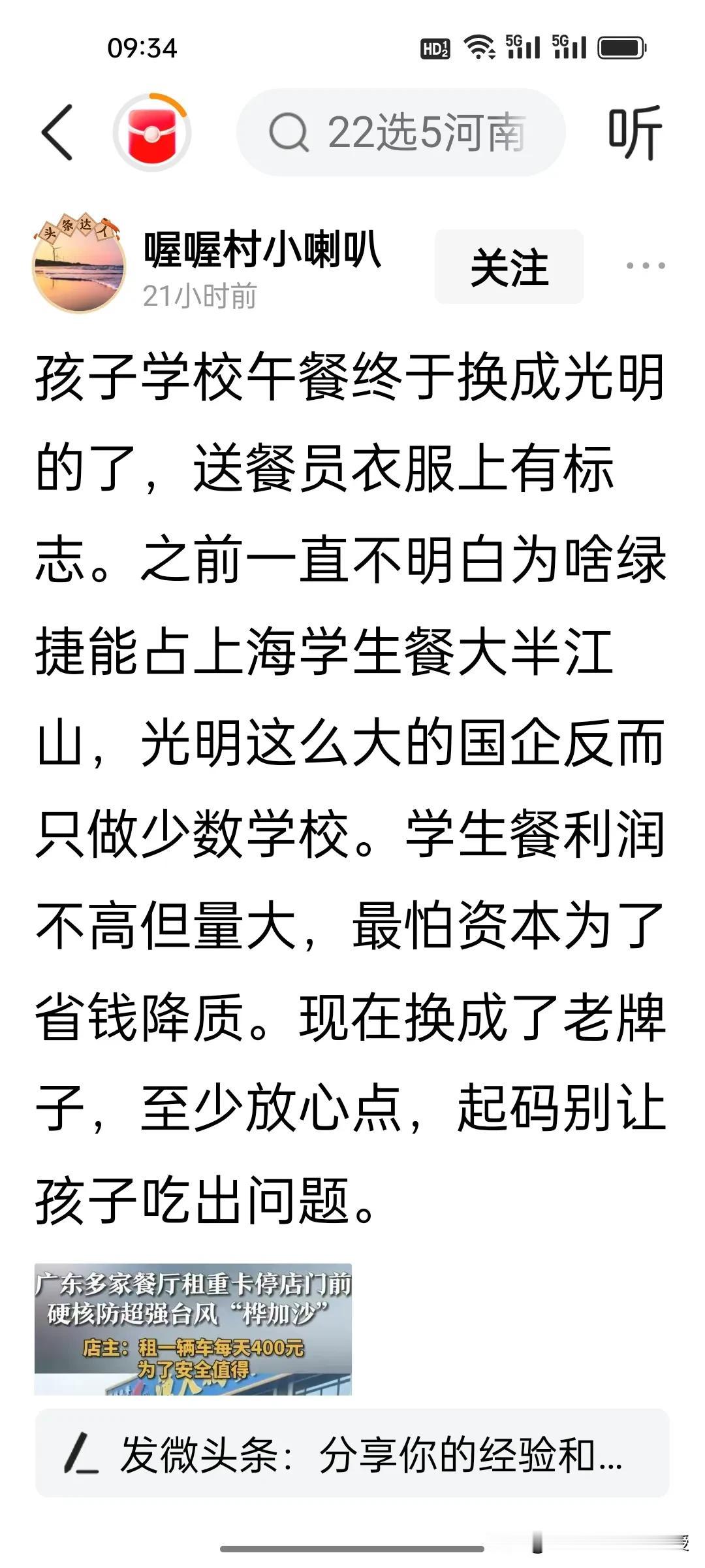 网上看到不少上海家长说孩子的午餐换成光明集团供应了,送餐的人员工作服上有光明的牌子,伙食也好了很多,现在总算放心了。现在网络上没有光明集团每天供餐的出餐量,但是要取代日供50万份庞大数量的绿捷还是有难度的。 光明食品集团这几年确实在运营社区食堂,如光明城市厨房,静安区曹家渡社区食堂,经营早中晚餐,每餐提供20种菜品选择,价格在20元左右。另外,光明目前已为上海10所中小学提供餐食服务,并为29家幼儿园供应食材,也从来没有出现过食安问题。 目前,上海市教委还没有出光明集团取代绿捷供餐的消息,如果有学校供餐单位换成了光明,那也可能只是小范围的,供餐单位换本土国企肯定是对的,以国企信誉和全链条保障能力接棒,无疑是守护校园食安的关键一步。