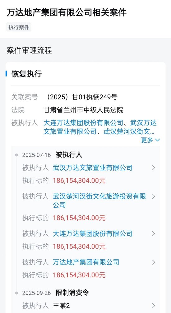 据天眼查,近日,大连万达集团股份有限公司及其法定代表人王健林等被限制高消费。案件流程显示,此前,大连万达集团股份有限公司、万达地产集团有限公司等因此案被强制执行1.86亿。
