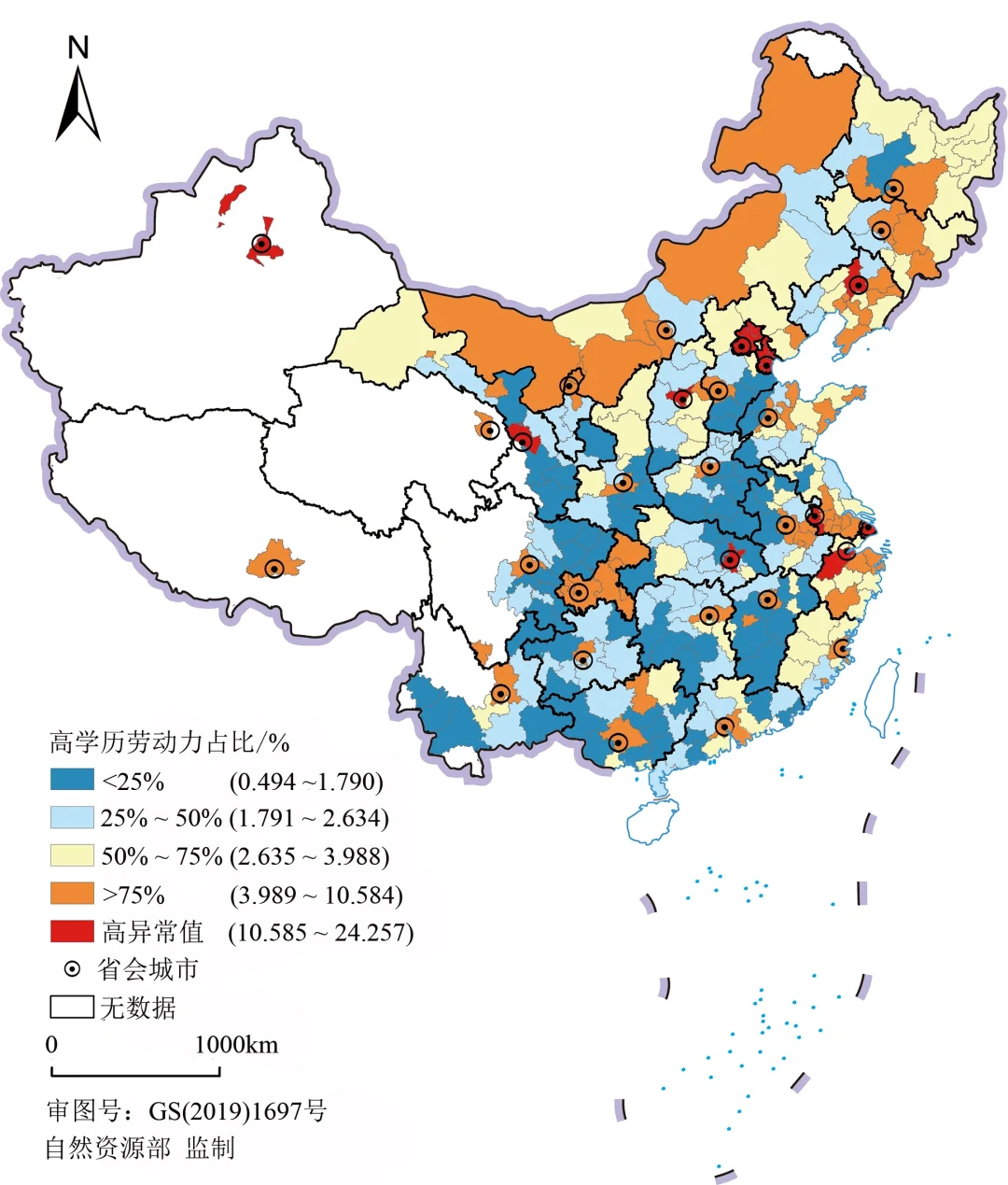 [一R]高学历劳动力呈现出集聚分布和东中西地带性分异的空间格局特征,东部沿海是主要分布区。