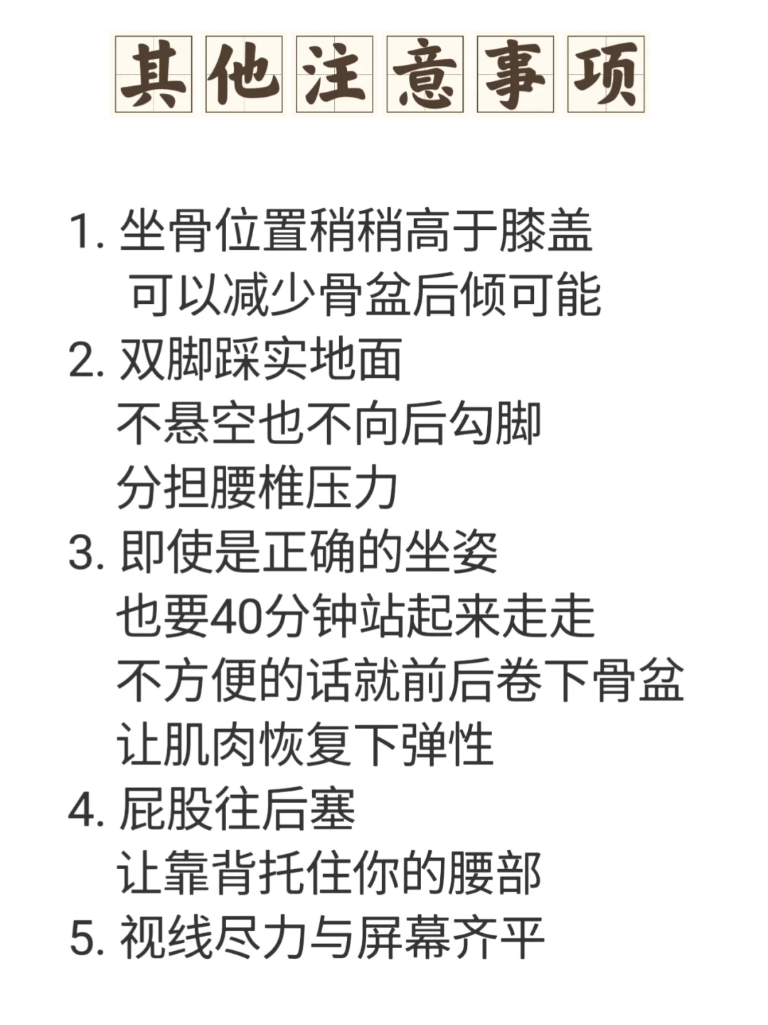 3. 即使是正确的坐姿,也要40分钟站起来走走,不方便的话就前后卷下骨盆,让肌肉恢复下弹性