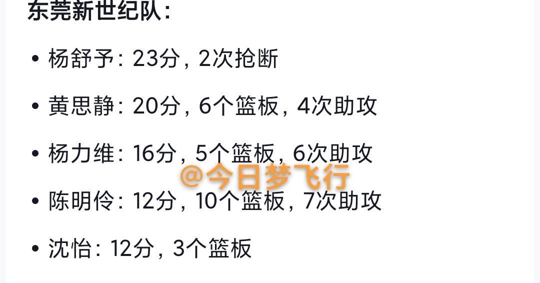 东莞新世纪28分狂胜日本红浪队,勇夺女篮亚洲联赛冠军!南粤玫瑰广东女篮一年两冠! 继今年年初夺得WCBA总冠军后,今晚进行的女篮亚洲联赛决赛,东莞新世纪队以95-67战胜日本富士通红浪队,夺得本届女篮亚洲联赛冠军。 本场比赛,四节的比分是:18-18,23-9,25-15,29-25。是役球队5人得分上双,其中杨舒予砍下全场最高的23分,黄思静20分,杨力维16分,陈明伶12分,沈怡12分。 在全场观众不时的“中国队加油!新世纪必胜!”加油助威的呐喊口号声中,东莞新世纪的姑娘们越战越勇,从第二节起全程碾压小日子。比赛进行中,还出现了激动人心的时刻,在没有现场音乐的伴奏下,现场观众自发高声齐唱《歌唱祖国》。