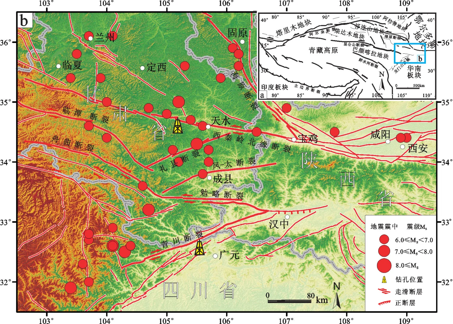 🇨🇳川甘陕交汇部位地震活动危险性探讨:川甘陕交汇地区处于阿拉善地块、祁连地块、柴达木地块和鄂尔多斯地块交界地带(图1-a),具有构造复杂和全新世以来断裂活动强烈的特点,是著名的南北地震带及青藏高原东北缘的重要组成部分,其复杂多样的构造变形模式和构造活动特征是该地区中强地震孕育和发生的重要原因。
