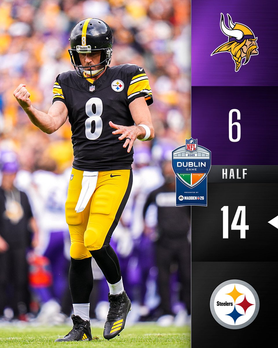 NFL官方X账号发推特报道,半场结束:@AaronRodgers12率领的@steelers在爱尔兰保持领先。@NFLUKIRE