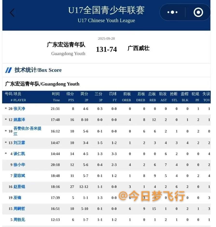 U17全国赛广东宏远首战大胜广西威壮,15岁中锋姚嘉泽砍下16分12篮板! 9月28日,U17全国赛在上海浦东开赛,首个比赛日,广东宏远以131-74大胜广西威壮,取得开门红。 本场比赛,广东宏远8人得分上双,最抢眼的当数史鸿飞派出跳级参赛今年才15岁,身高2米10的中锋姚嘉泽,姚嘉泽首发出场出战17分48秒,10投8中,得16分12篮板2助攻2抢断1盖帽的全面数据。 因骨折去年停赛一年的大前锋赵昱锟,出战18分16秒12投全中,三分球1投1中,砍下全场最高的27分4篮板2助攻6抢断2盖帽。 得分上双的球员还有:谈仁凯14分,徐少华12分,梁琼斌11分,吾赞依尔、刘卫霖、周嗣哲分别得10分。 参赛名单中的夏振峰正参加U18广东全运队集训,没有随队参赛。刘朕赫在美留学,朱森铭正在疗伤,缺席今次的比赛。 29日上午八点半,广东宏远迎来预赛的第二个对手广西体校队。预料广东宏远将会拿下这场比赛,迎取两连胜。