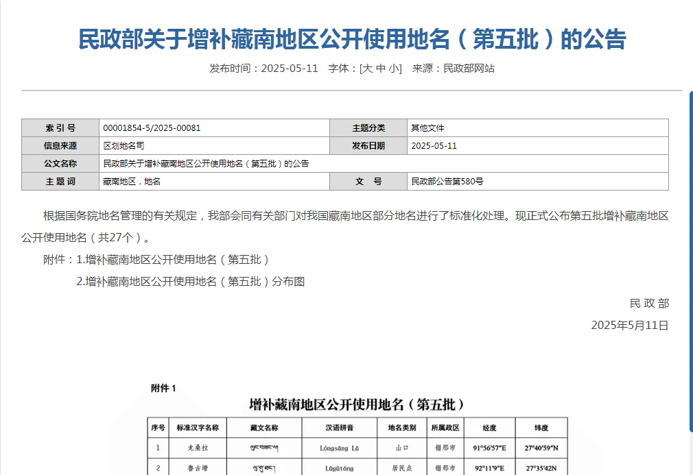 🇨🇳2025年5月11日,印巴停火次日,我国民政部正式发布公告,对藏南地区部分地名进行标准化处理,新增27个公开使用地名。这是自2017年以来中方第五次系统推进藏南地名标准化工作,累计命名量已超百个,覆盖错那、墨脱、察隅、隆子四县关键区域。引发印度强烈反应与国际社会广泛关注。