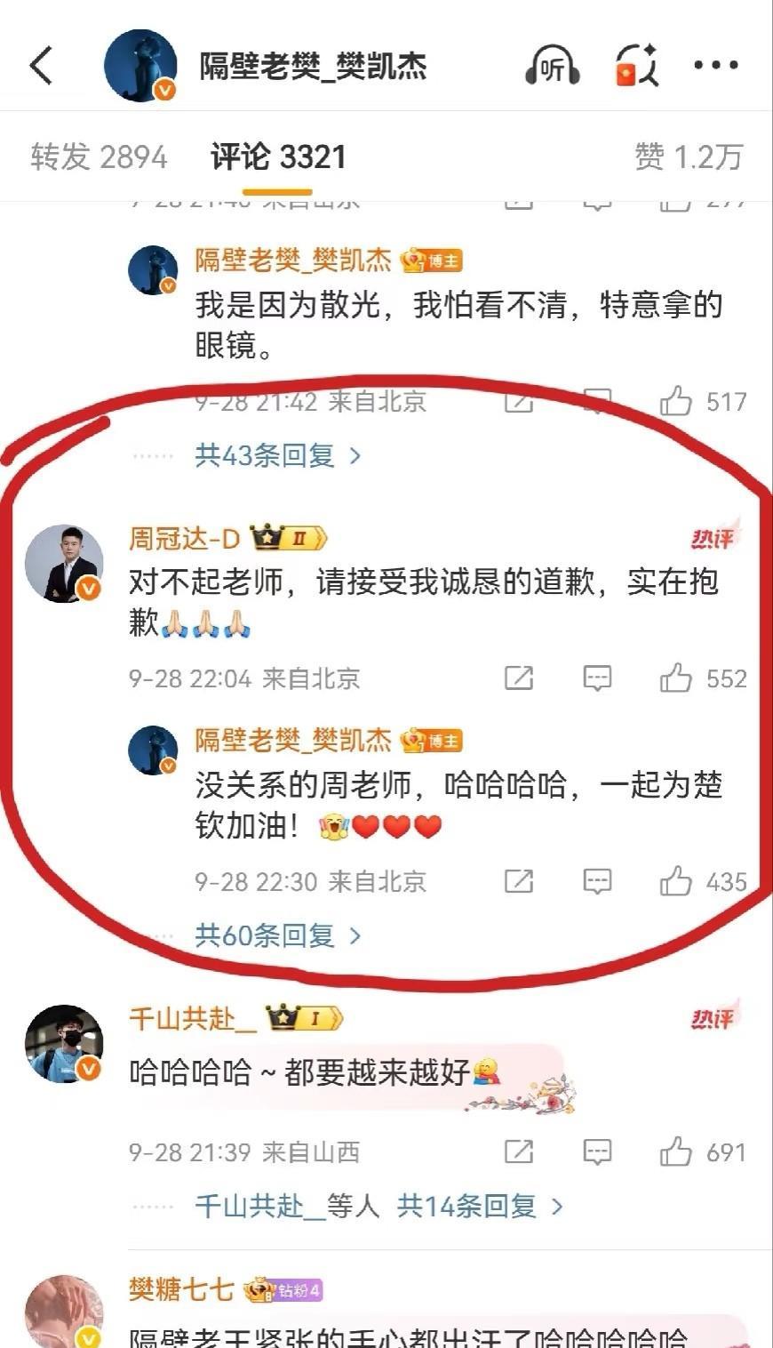 哈哈,樊志杰够幽默的啊![呲牙]“我是隔壁老樊,老王在场上打球”。知道有人在蛐蛐他,他自己赶紧出来解释一下。 隔壁老樊来看隔壁小王比赛,前几天小王去看老樊的演唱会,好朋友互相捧场。 被叫隔壁老王的隔壁老樊,周冠达老师还是过了一下下才反应过来自己说错了,两人微博还互动起来了呢。[呲牙]