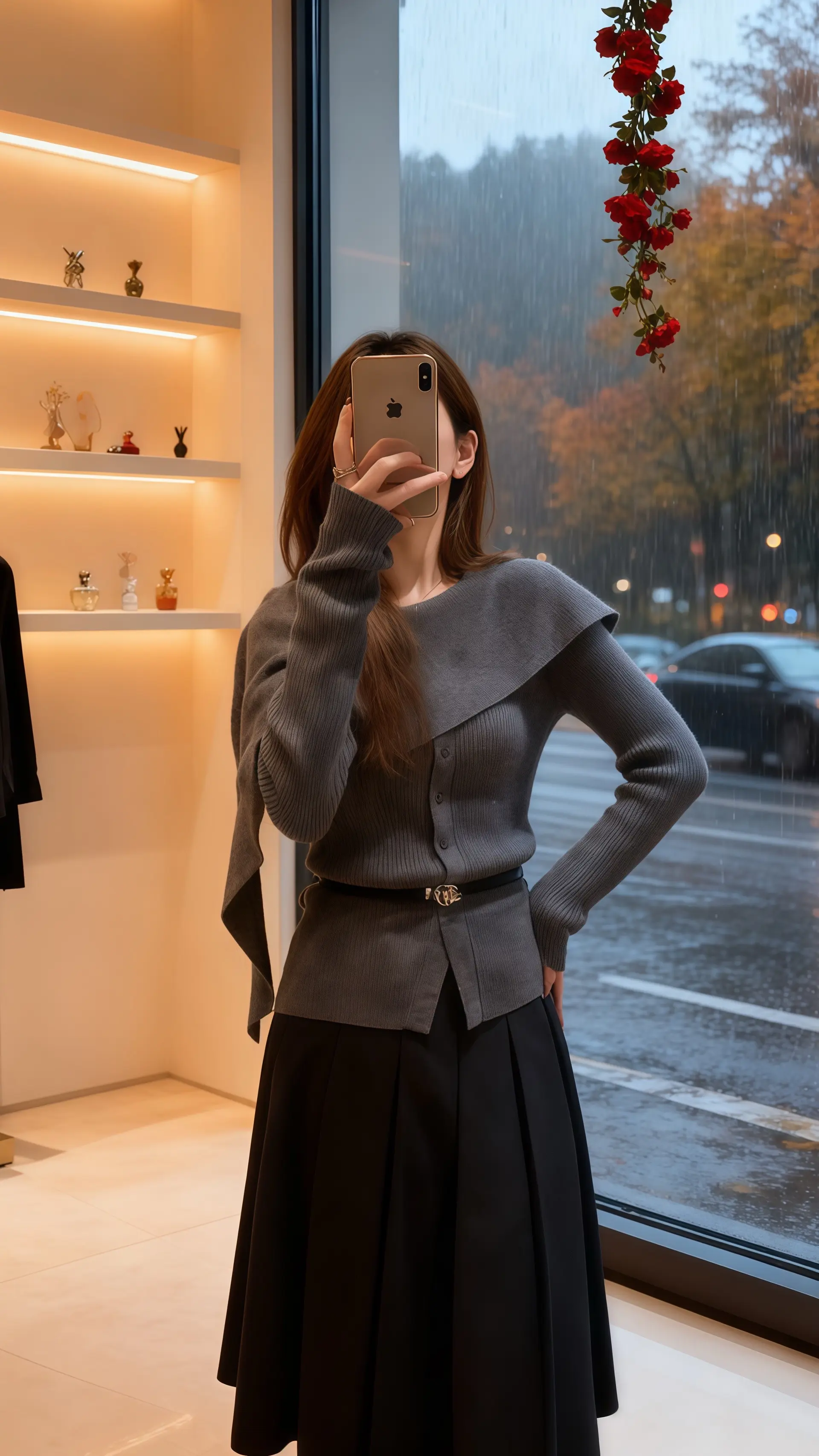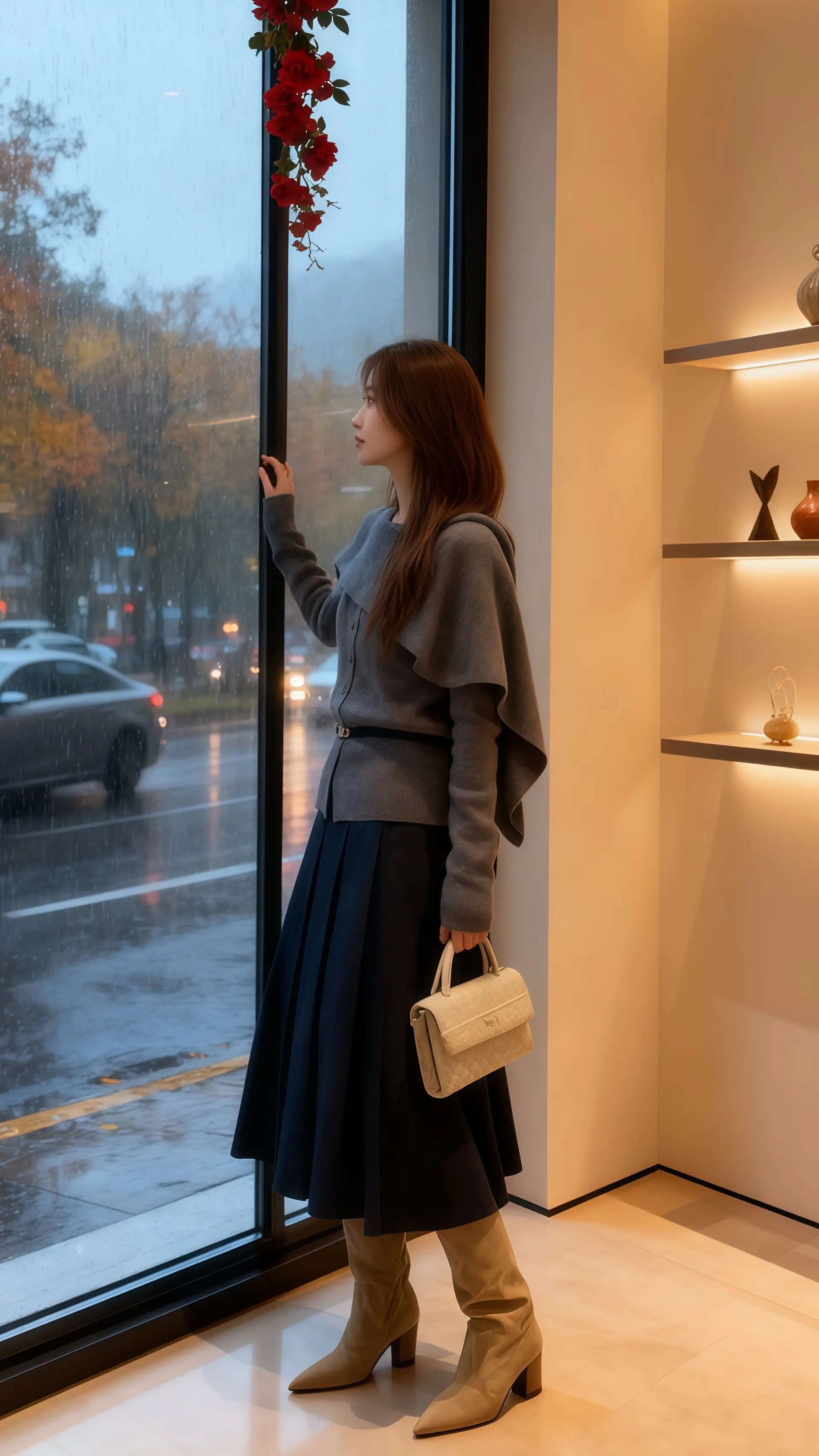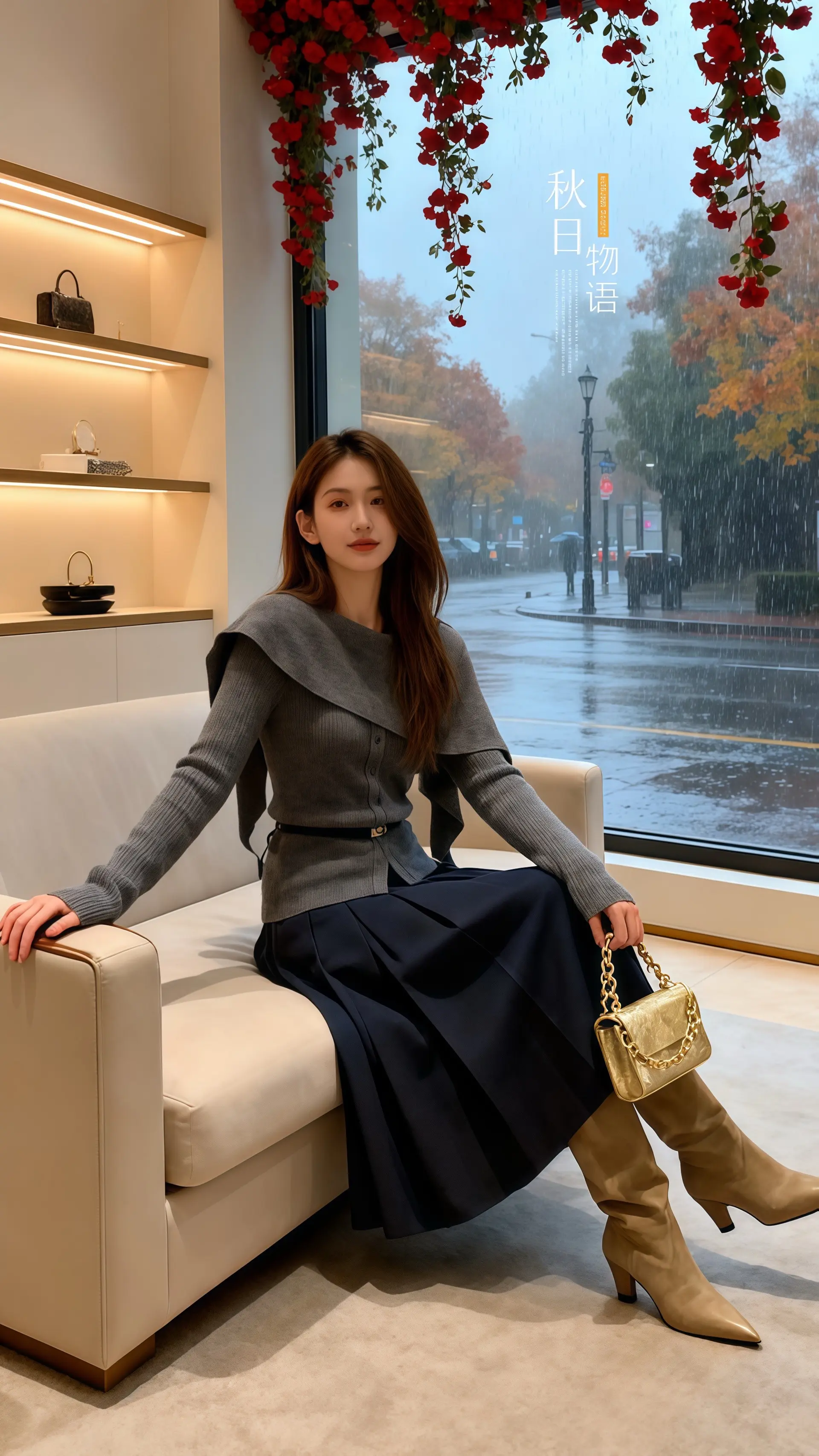 她穿着法式气质两件套,针织上衣的设计感与百褶半身裙的浪漫交织,在秋天朦胧的小雨里,晕染出独属法式的优雅风情。漫步于高级感女装店的落地窗前,暖光勾勒出针织纹理的细腻,百褶裙摆随步履轻晃,似把秋日的温柔都藏进了衣褶。窗外小雨朦胧了街景,汽车驶过留下斑驳灯影,电影感的画面里,她这身两件套将法式浪漫与秋日诗意糅合,在轻奢氛围的店铺中,成为优雅与质感并存的时尚注脚,每一处细节都在诉说着秋日里的法式腔调。