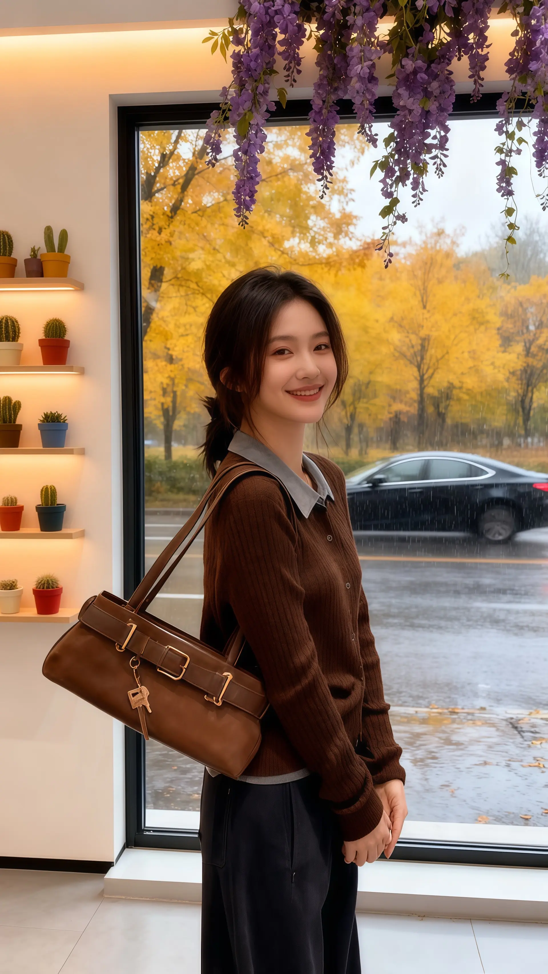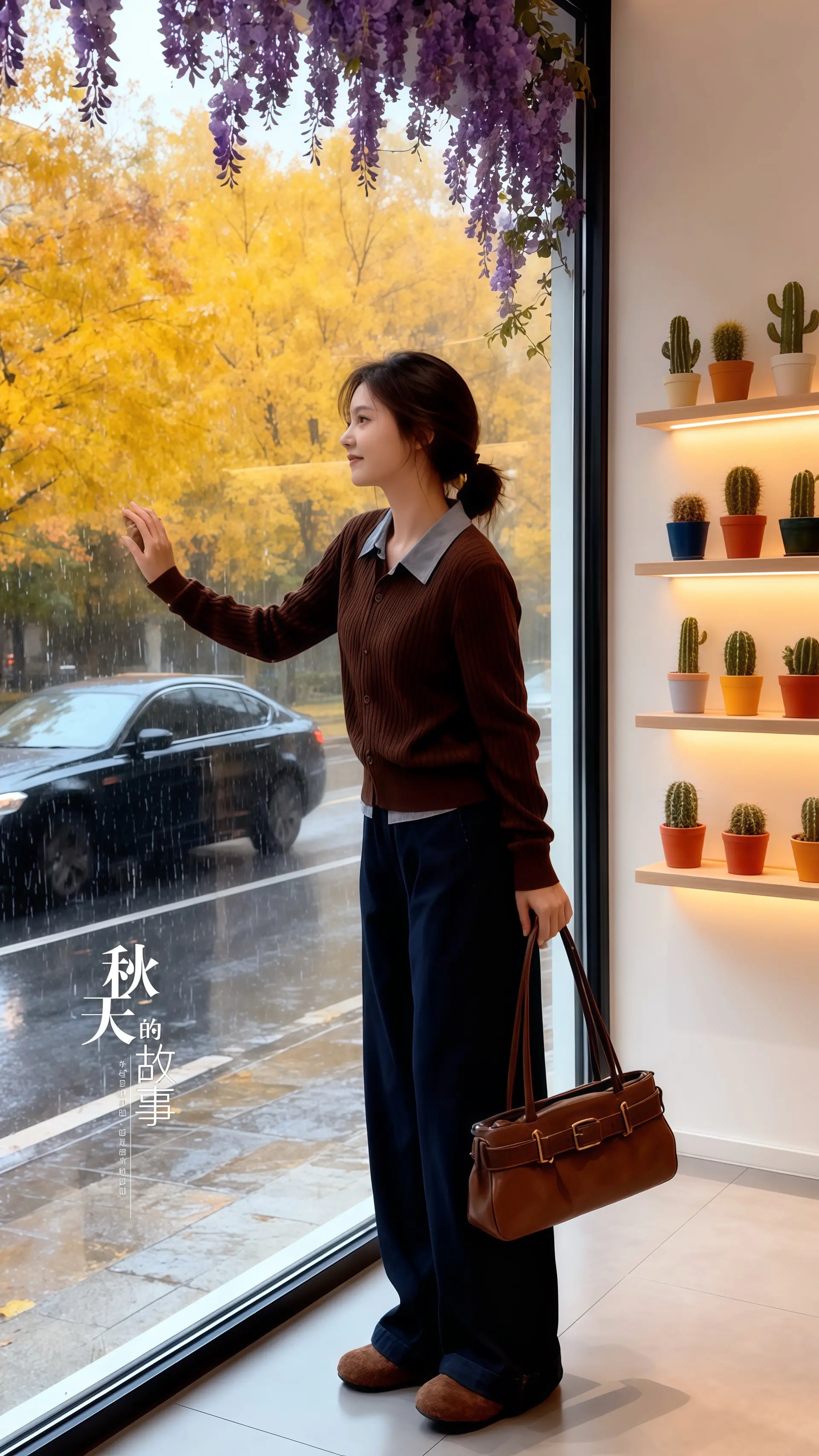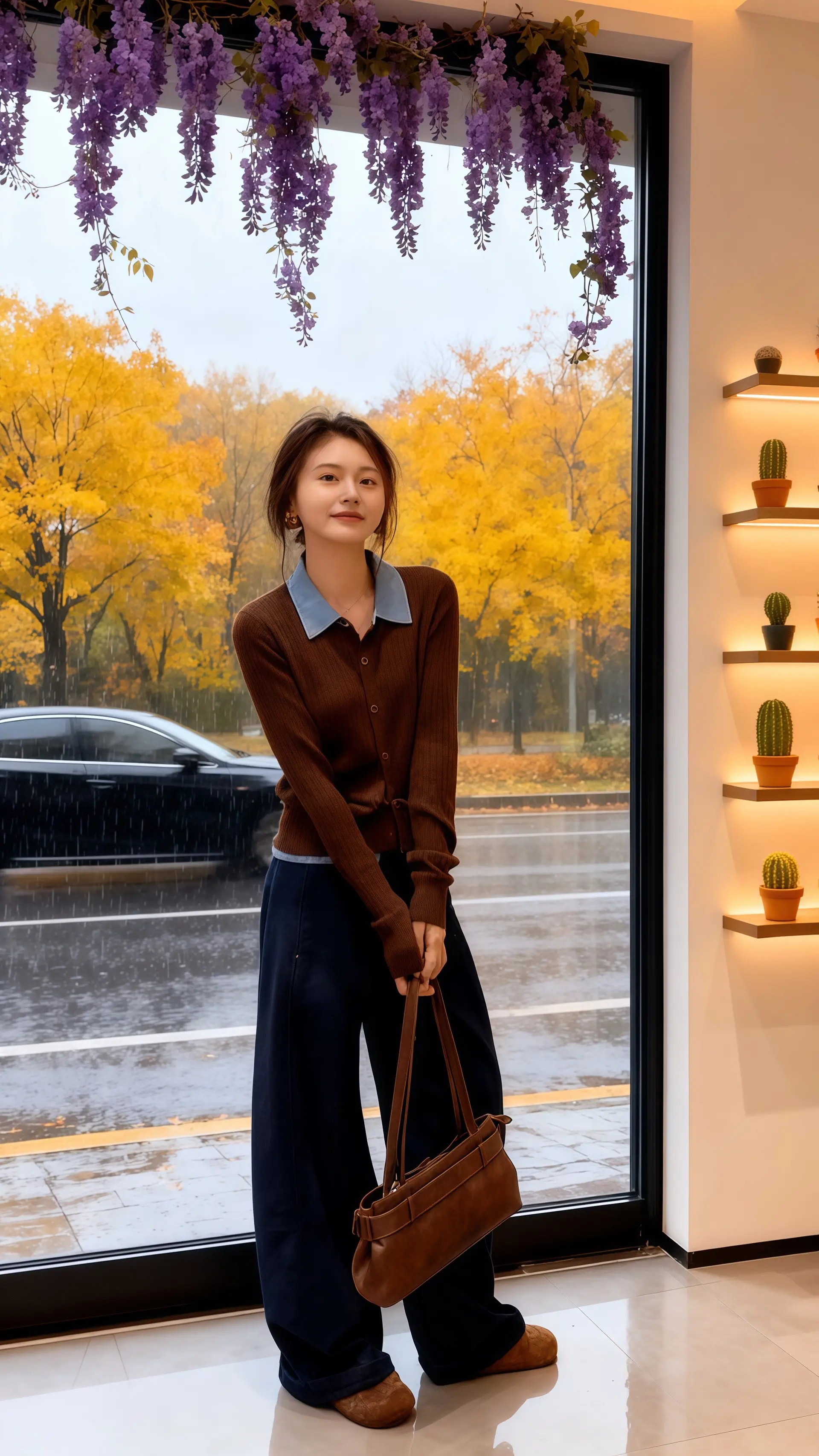 她穿着含蓄设计感拼接衬衫,领口的蓝灰色与棕色针织碰撞出低调的高级感,在秋日小雨中氤氲出温柔的氛围。这套韩系两件套,用简约版型勾勒出随性的慵懒感,恰到好处的宽松设计,藏住了秋意渐浓的微凉。袖口的褶皱细节与衣摆的系带元素,在朦胧雨雾中若隐若现,像一首没有写完的诗,留下无限遐想。脚下的深灰色阔腿裤与棕色手提包,在暖光映照下泛着柔和光泽,与窗外金黄的秋叶、朦胧雨景相映成趣,共同谱写了一曲秋日的优雅颂歌。