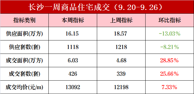 新房市场方面,上周(9.20-9.26)长沙内五区(含高新区、长沙县托管区域)一手住宅成交426套、6.03万方,成交均价13092元/㎡。供应上,一手住宅供应1118套、16.15万方。