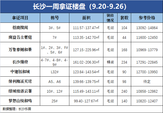 新房供应方面,根据长沙市住建局官网信息及克而瑞湖南统计显示,上周(9.20-9.26)内五区新增供应房源1118套,共计16.15万方。有8项目拿证,具体情况如下图: