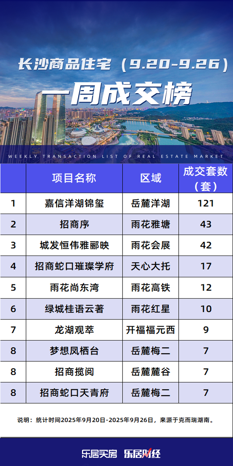9.20-9.26,长沙内五区哪些楼盘网签成交套数更多?根据克而瑞湖南发布的内五区(含高新区、长沙县托管区域)商品住宅成交榜单显示,嘉信洋湖锦玺、招商序、城发恒伟雅郦映、招商蛇口璀璨学府、雨花尚东湾、绿城桂语云著、龙湖观萃、梦想凤栖台、招商揽阅、招商蛇口天青府等10个楼盘上榜。榜首成交套数121套,第十名成交7套。