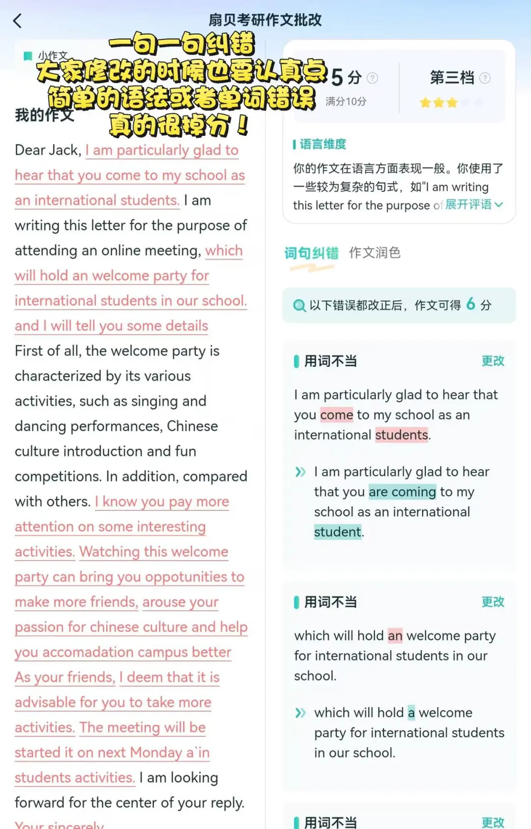 ⚠️前面认真听课➕默写的同学,应该是能写出来的。写完之后批改,再背背老师的作文,如果思路差别大,也可以再听听课,第二天找时间再默写一遍。