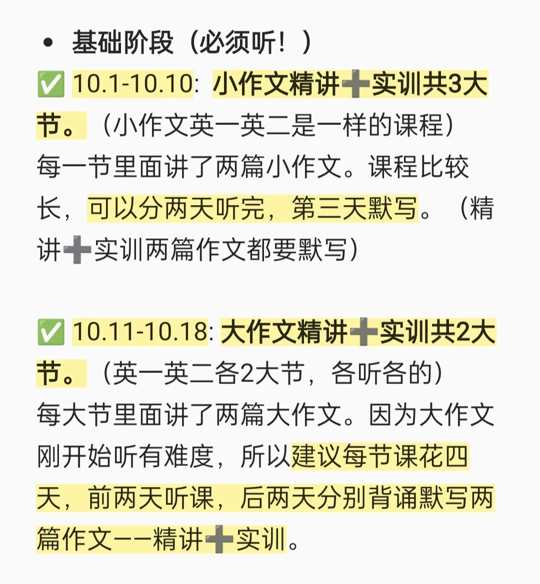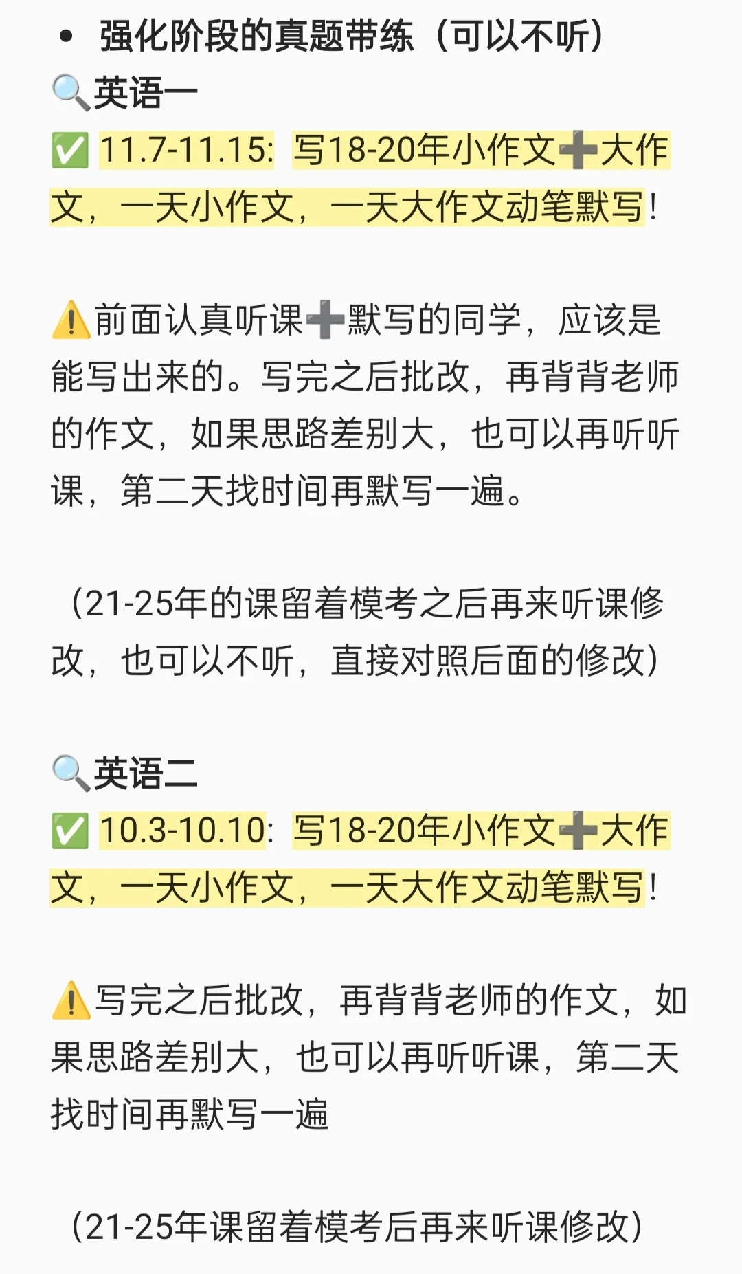 ✅ 10.11-10.18: 大作文精讲➕实训共2大节。(英一英二各2大节,各听各的)