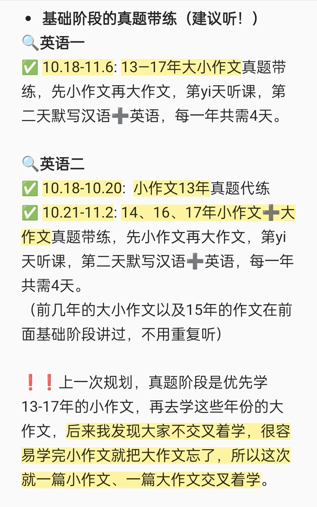 ❗❗上一次规划,真题阶段是优先学13-17年的小作文,再去学这些年份的大作文,后来我发现大家不交叉着学,很容易学完小作文就把大作文忘了,所以这次就一篇小作文、一篇大作文交叉着学。