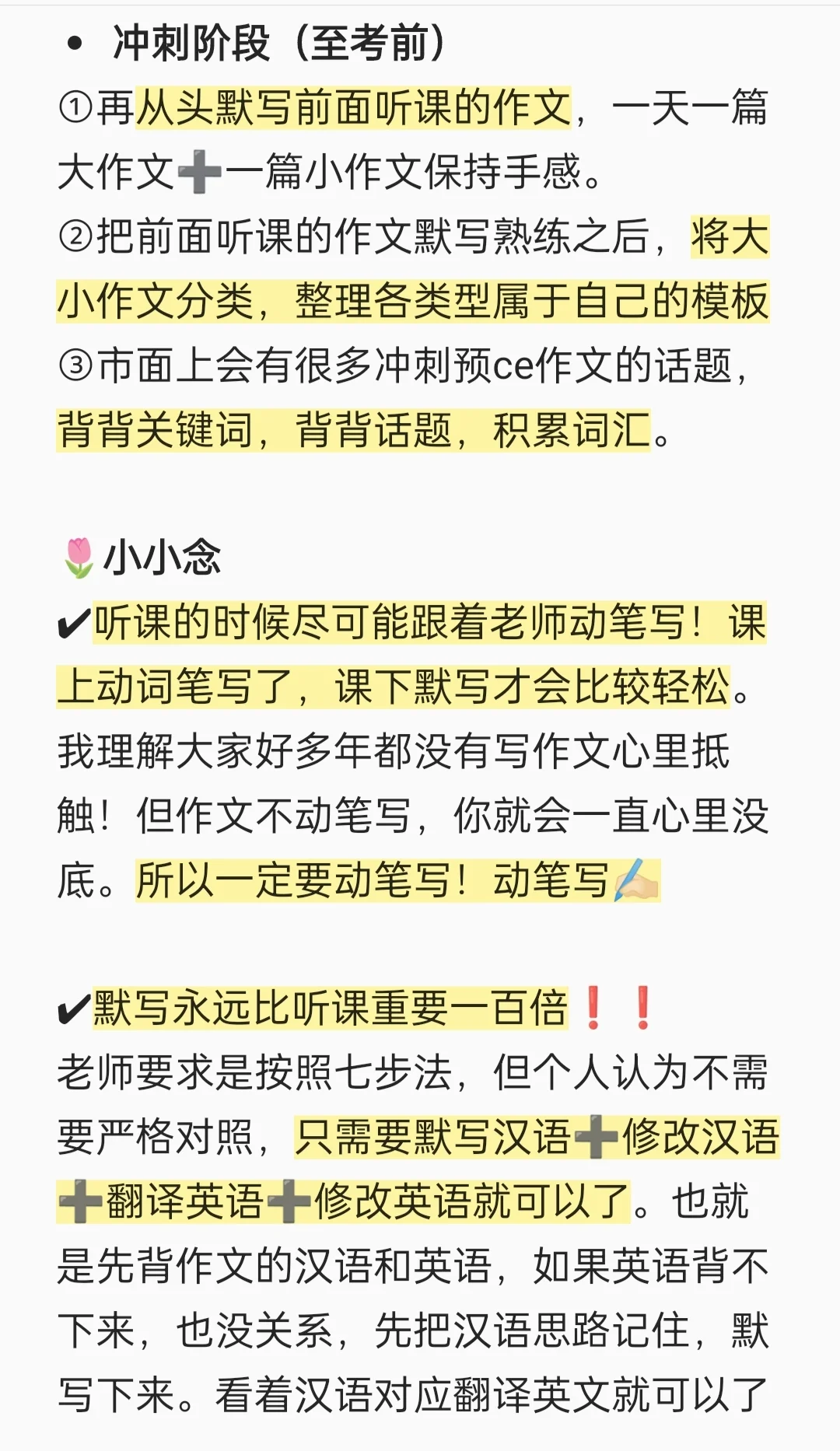 ①再从头默写前面听课的作文,一天一篇大作文➕一篇小作文保持手感。