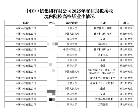 数据显示,总部中国中信有限公司共录用15人,其中清华大学6人、北京大学4人,金融学专业背景达6人,显示出“顶尖名校+金融学科”的鲜明导向。