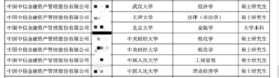 与之形成对照的是,中国中信金融资产管理股份有限公司录用7人,北大仅1人,而在中央财经大学和中国人民大学各录用2人,其中金融学专业仅一位。
