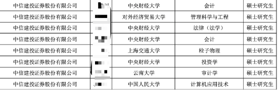 中信建投证券股份有限公司则录用8人,无清北身影,录用中央财经大学4人,录用中国人民大学1人,均非金融学专业。