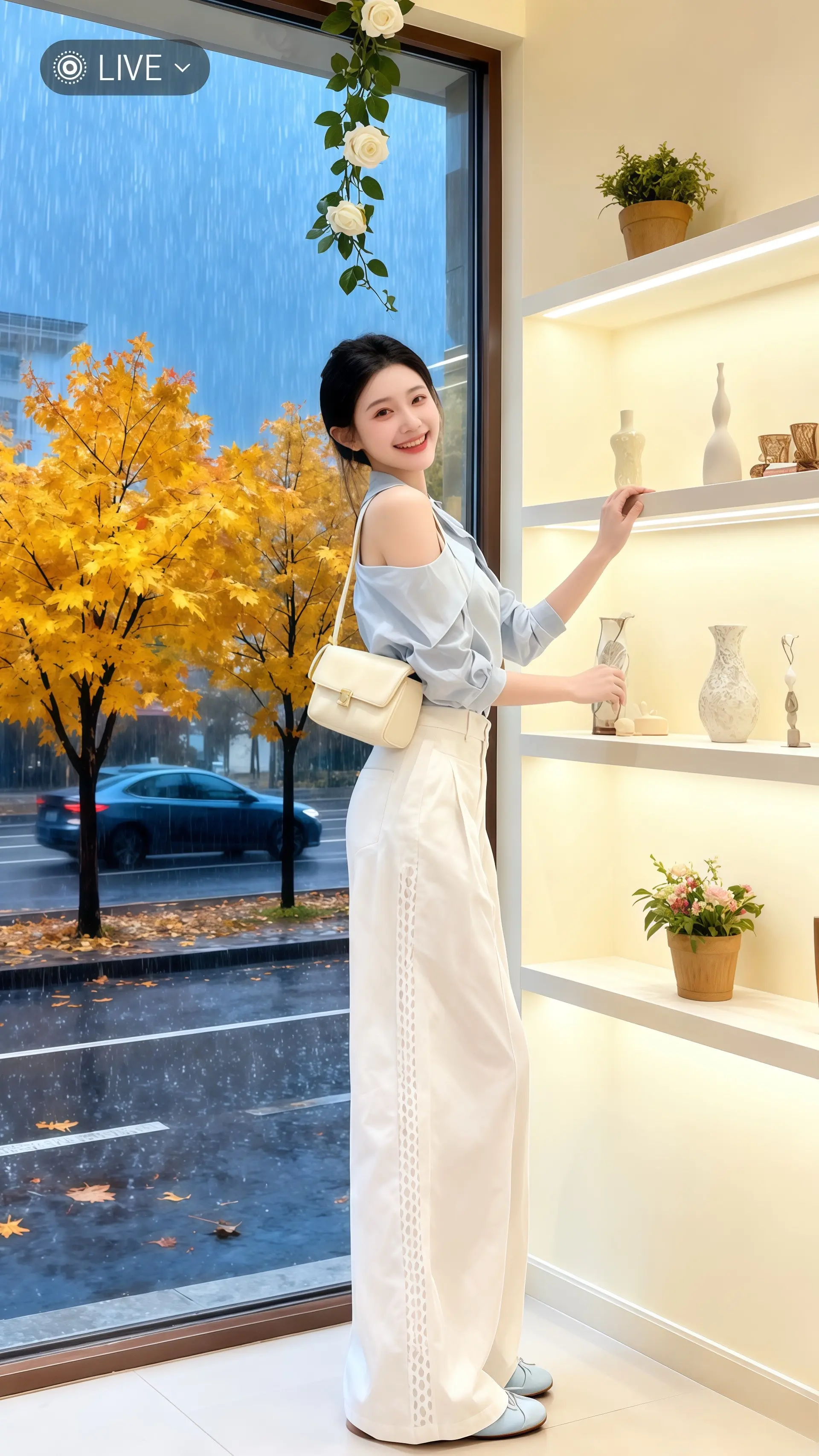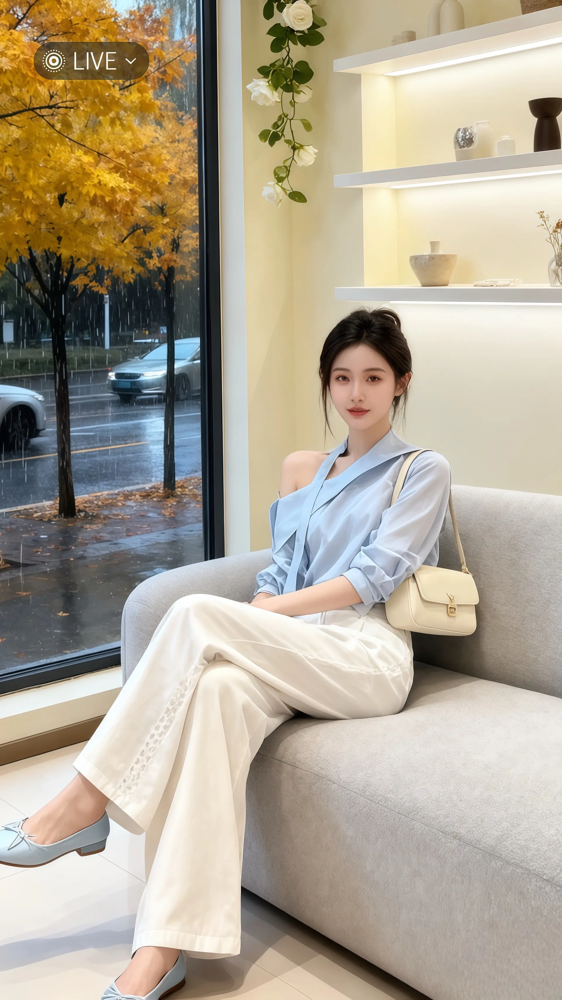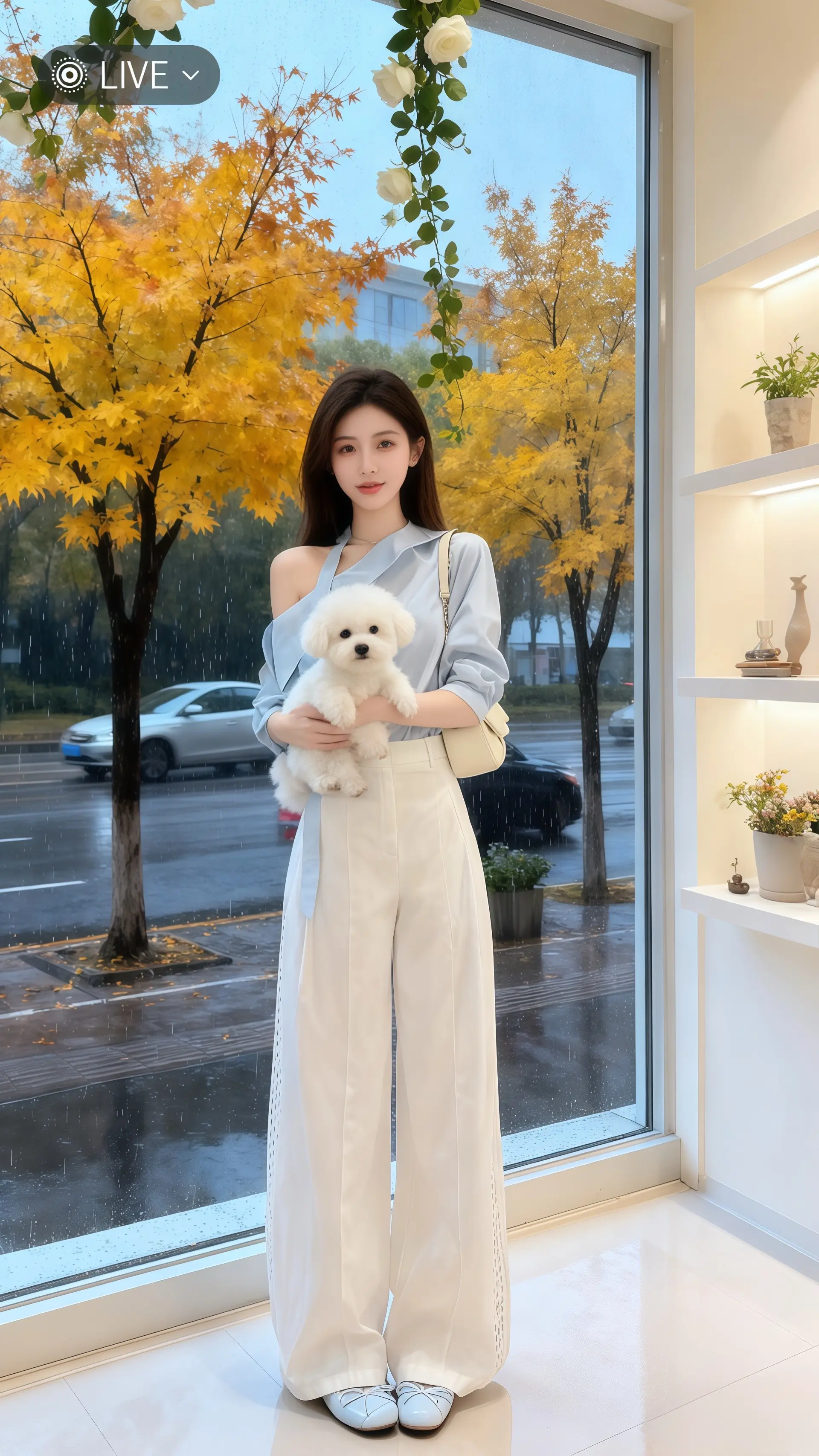 她身着高级感气质两件套,浅蓝色斜襟衬衫与白色阔腿裤的组合,在秋日女装店内自成风景。衬衫的斜襟设计似藏着优雅密码,阔腿裤随步履轻摇,将清冷与温柔揉进衣摆。落地窗外,细雨浸润着街道,金黄枫叶与雨滴共舞,为这组穿搭添了几分诗意。她时而轻抚假人模特肩头,同款套装在光影下更显质感;时而怀抱白色比熊,暖糯毛团与清冷衣装撞出奇妙火花;又或翘腿闲坐沙发,浅灰与米白交织出慵懒氛围。冷白灯光、精致摆件、雨幕街景,无一不在衬托这两件套的独特韵味。当季的温柔与高级,皆在这一衣一裤间流转,诉说着秋日独有的浪漫与优雅。