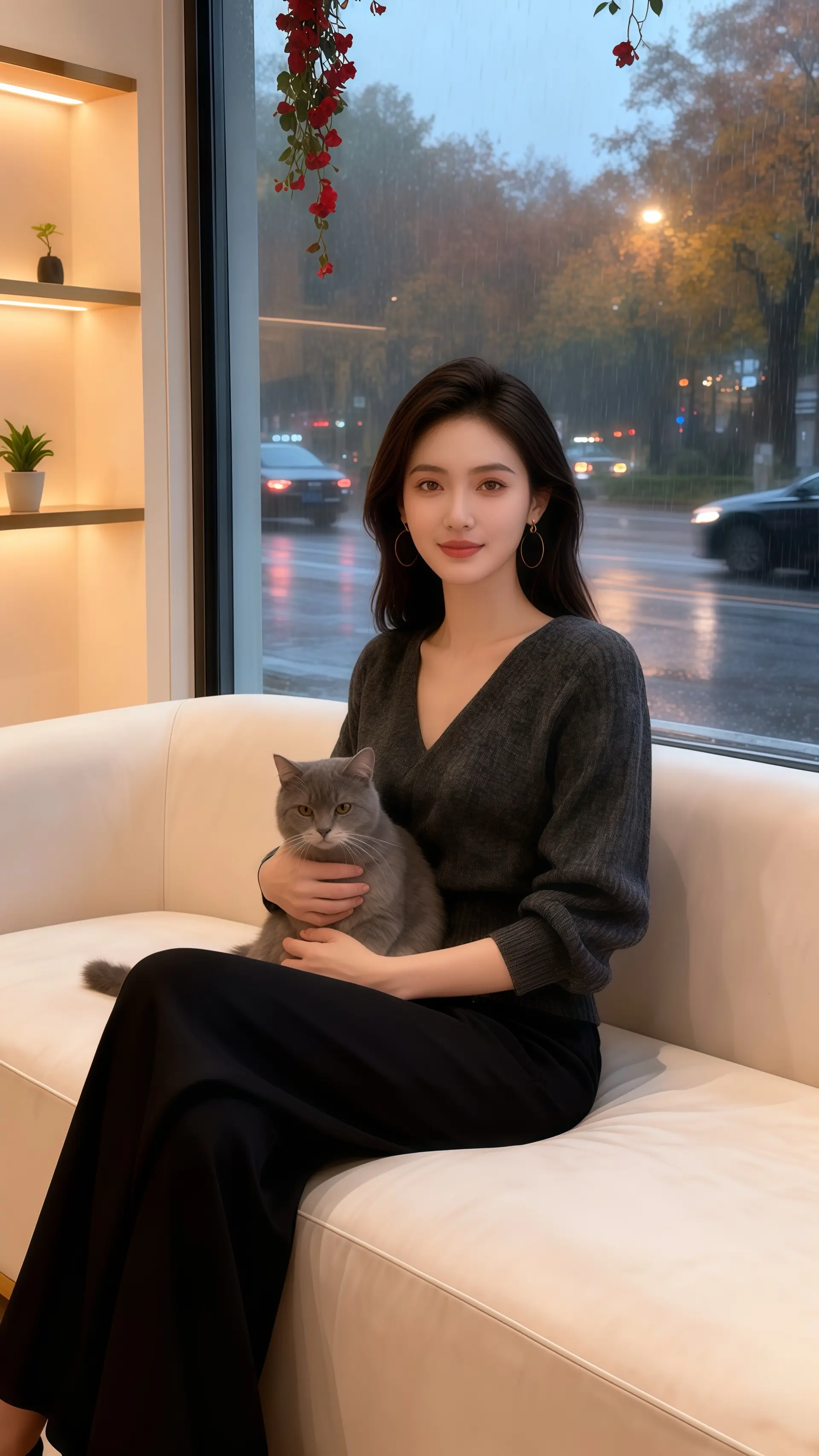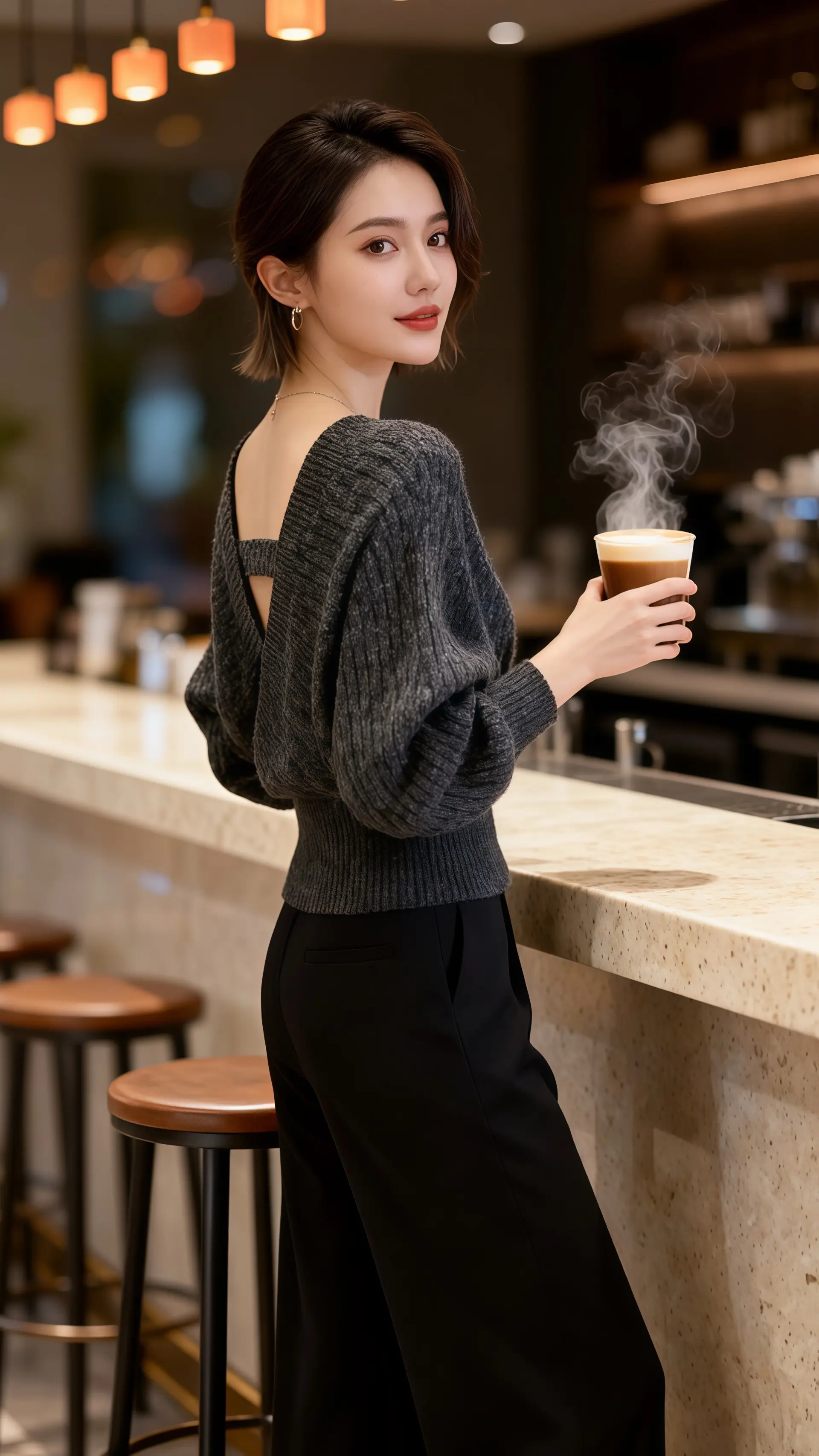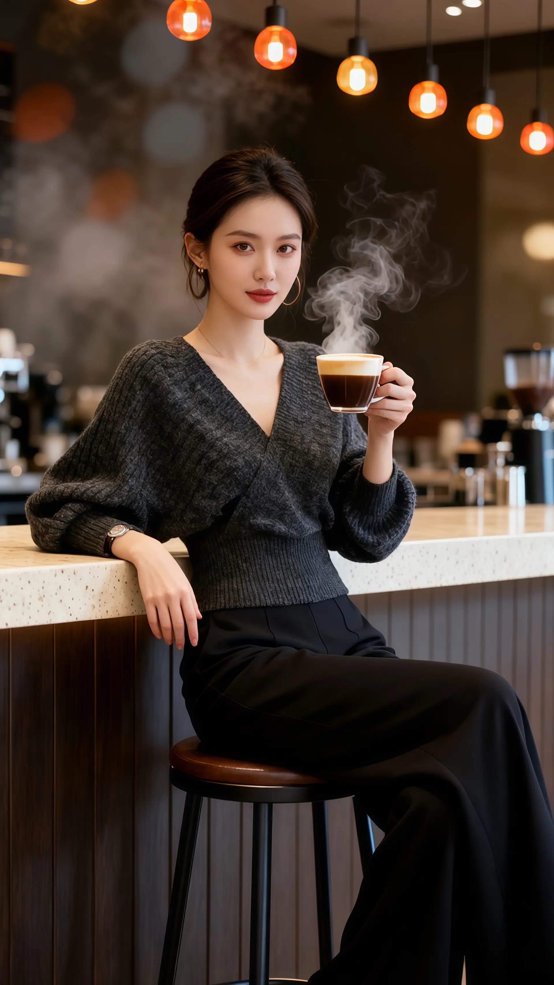 她穿着高级感气质两件套,深灰色针织上衣与黑色阔腿裤的组合,简约中透着精致。坐在轻奢风咖啡店的高脚凳上,手中端着一杯热气腾腾的咖啡,咖啡的醇香在空气中弥漫。背后暖色系小吊灯散发着朦胧光晕,营造出电影般的氛围感。这套穿搭将优雅与舒适完美融合,仿佛为都市生活量身定制,每一处细节都彰显着独特品味,在这静谧的空间里,她成为了一道亮丽的风景线,尽显从容与自信。